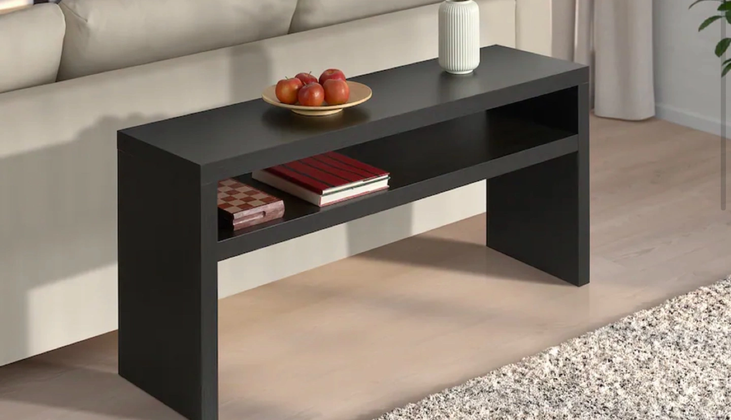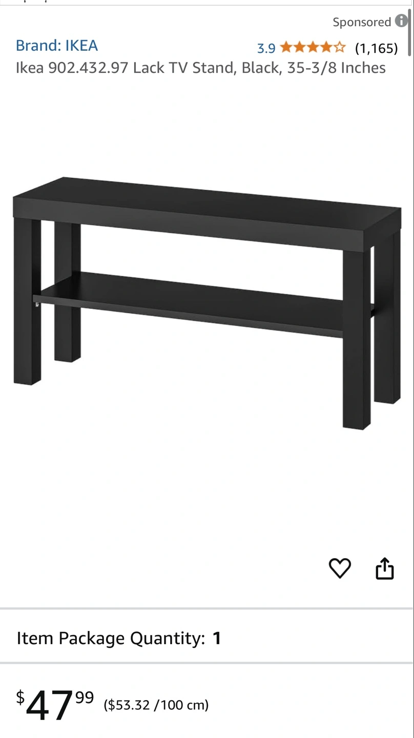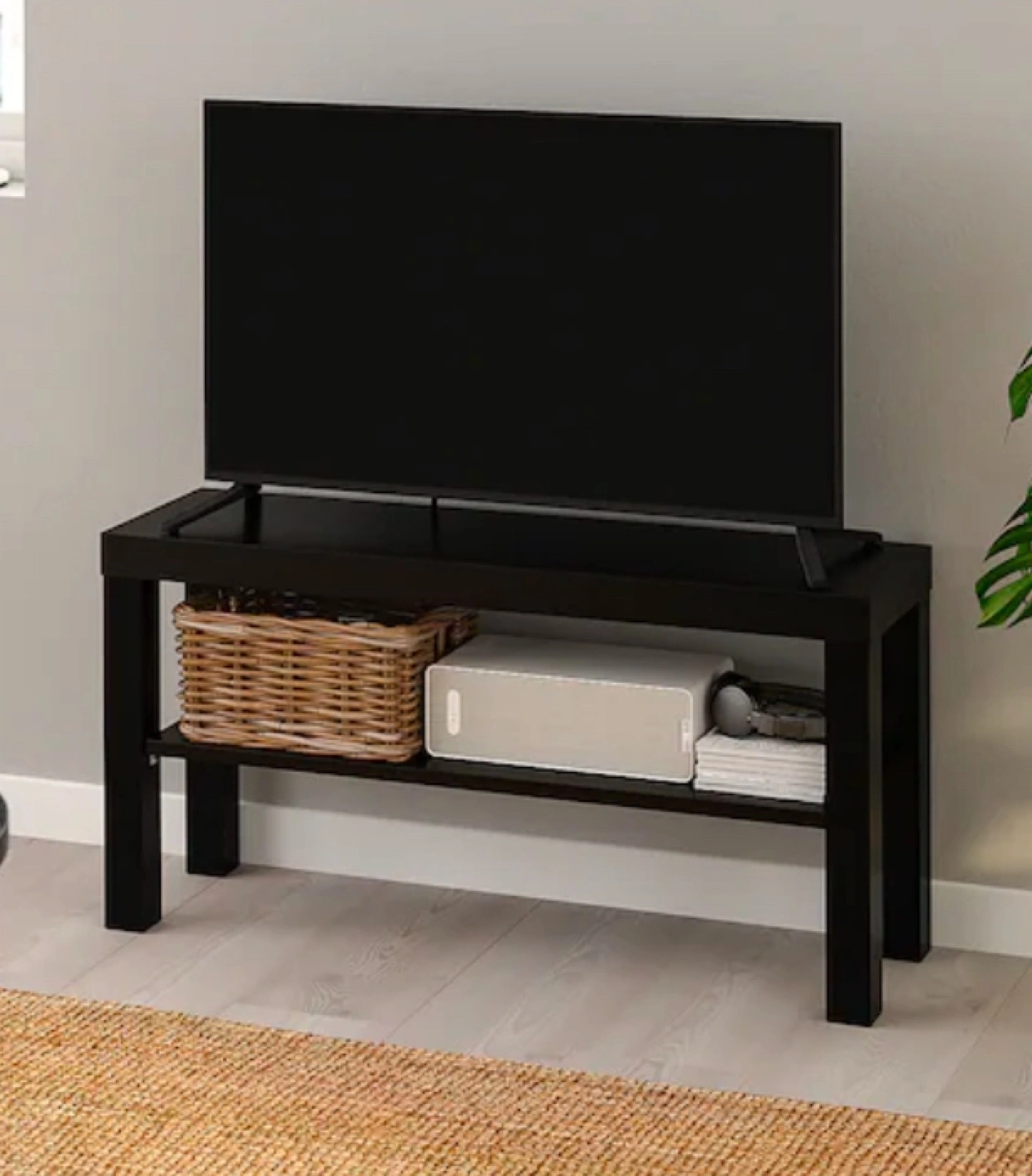 Black Ikea Lack TV stand. Simple design, with two shelves and lightweight. Great for small spaces. Already assembled. Please see photos for exact dimensions.