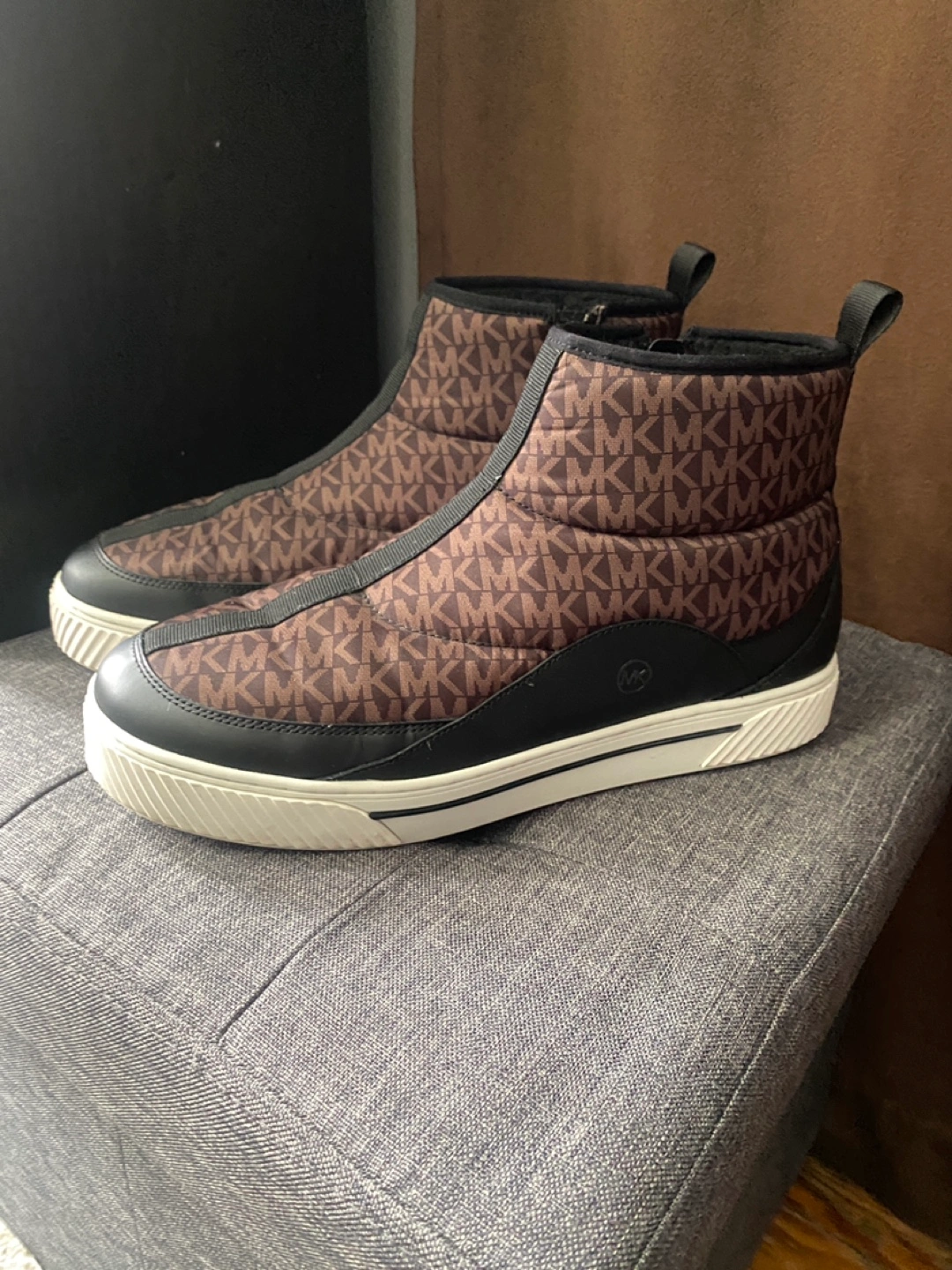 Women's or men’s high top boot hydrid sneakers. Brown MK signature print. Features a side zipper. White and black sole. Quilted upper. Cozy fleece lining. In great condition! Cash preferred pickup on Astoria Blvd South and 38th Street.