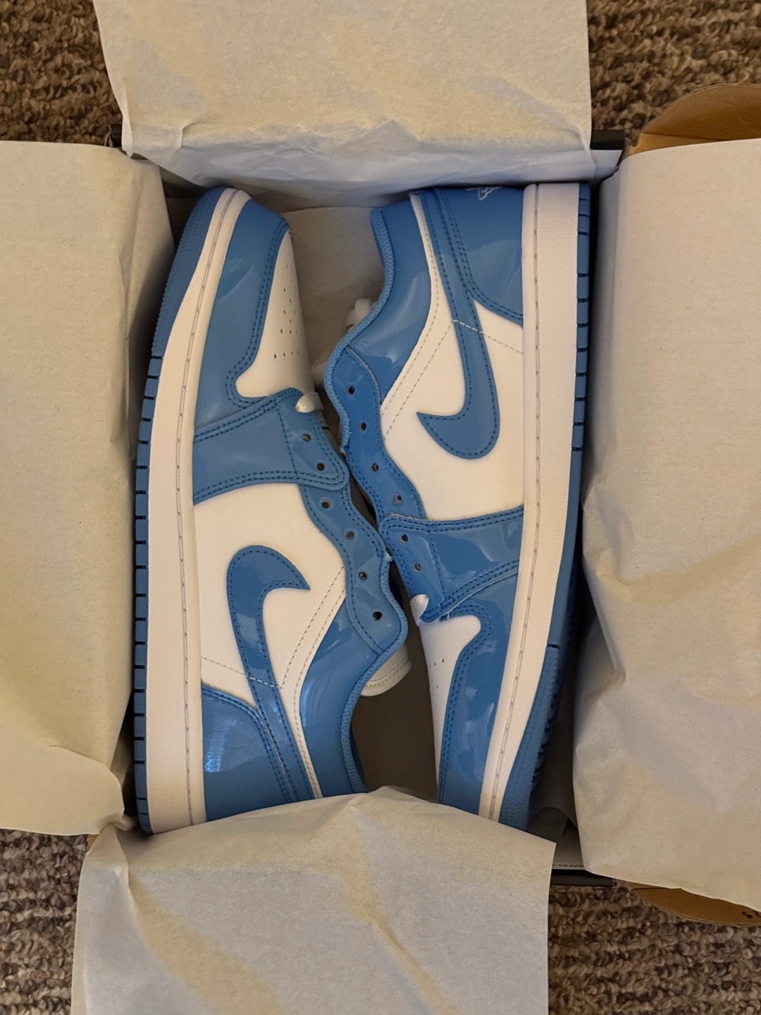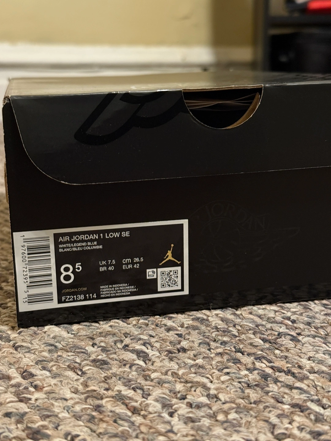 New Air Jordan 1 Low SE sneakers. Size 8.5. White/Legend Blue colorway. Shoes in original box. New in box.