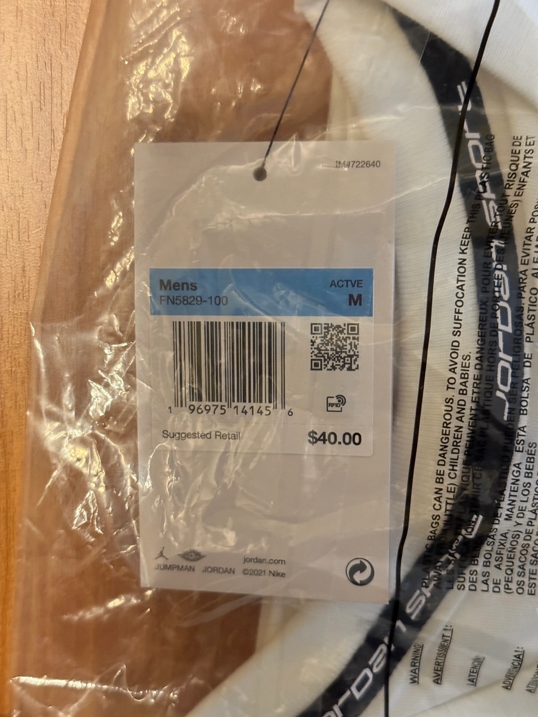 123Brand new with tags. Men's size medium active t-shirt. White color. Jordan brand. Suggested retail $40.00