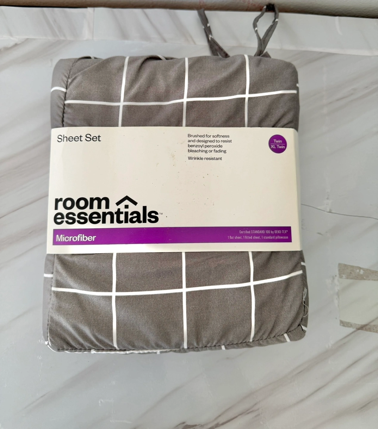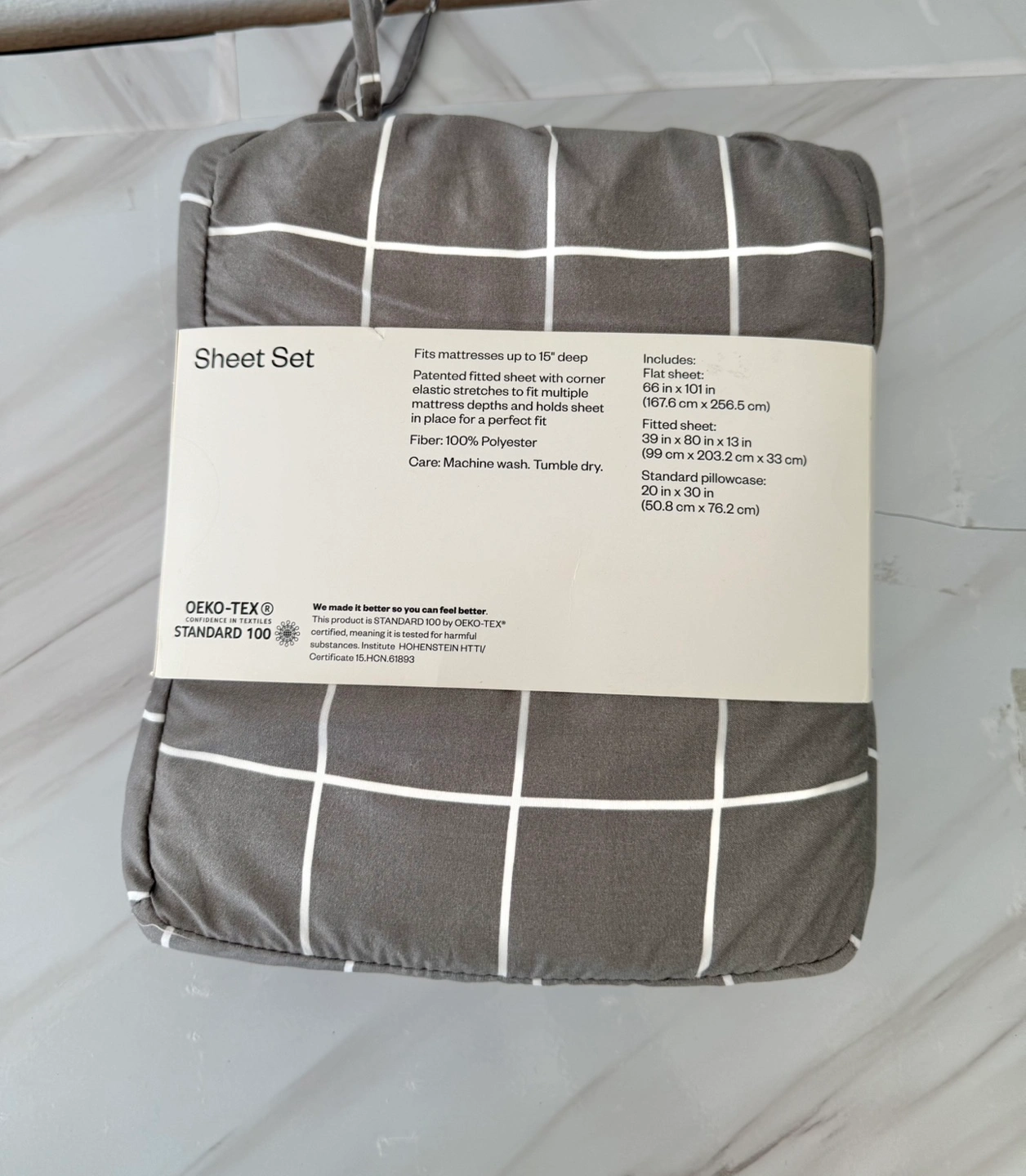 Twin XL microfiber sheet set. Gray and white grid pattern. Wrinkle resistant. Patented fitted sheet. Fits mattresses up to 15 inches deep. Includes flat sheet, fitted sheet, and standard pillowcase.