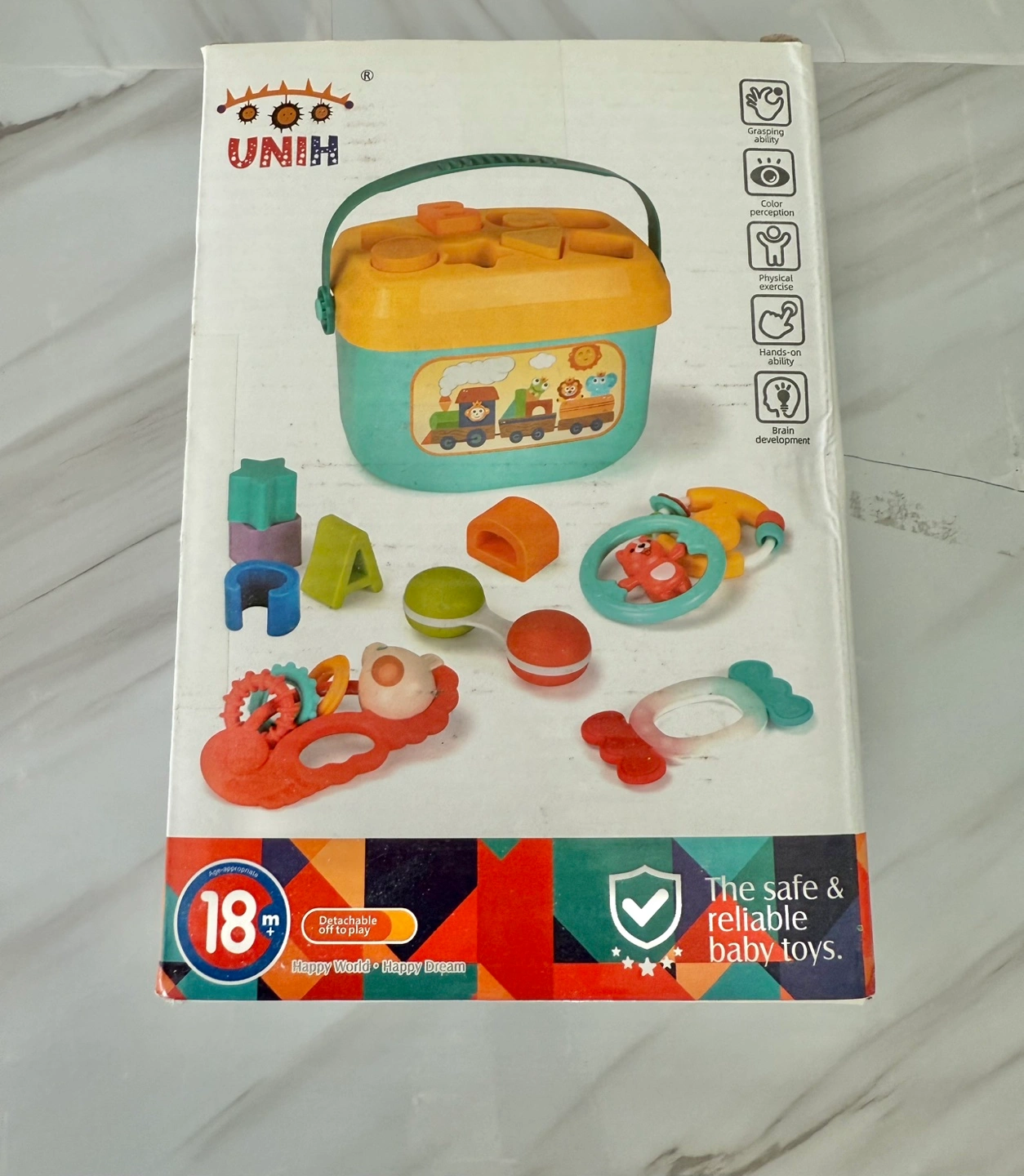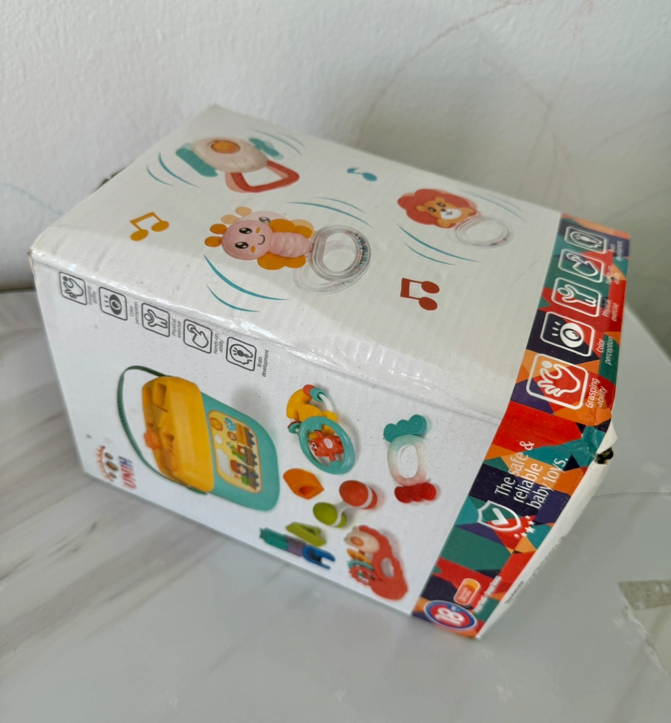 New baby toy set. Includes colorful blocks, rattles, and a handy carry case. Great for sensory and developmental play. Suitable for babies 18 months and up. Safe and reliable materials.