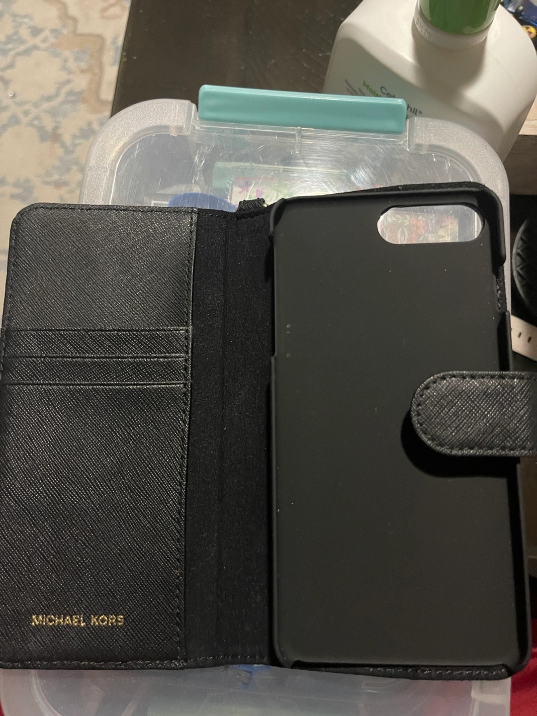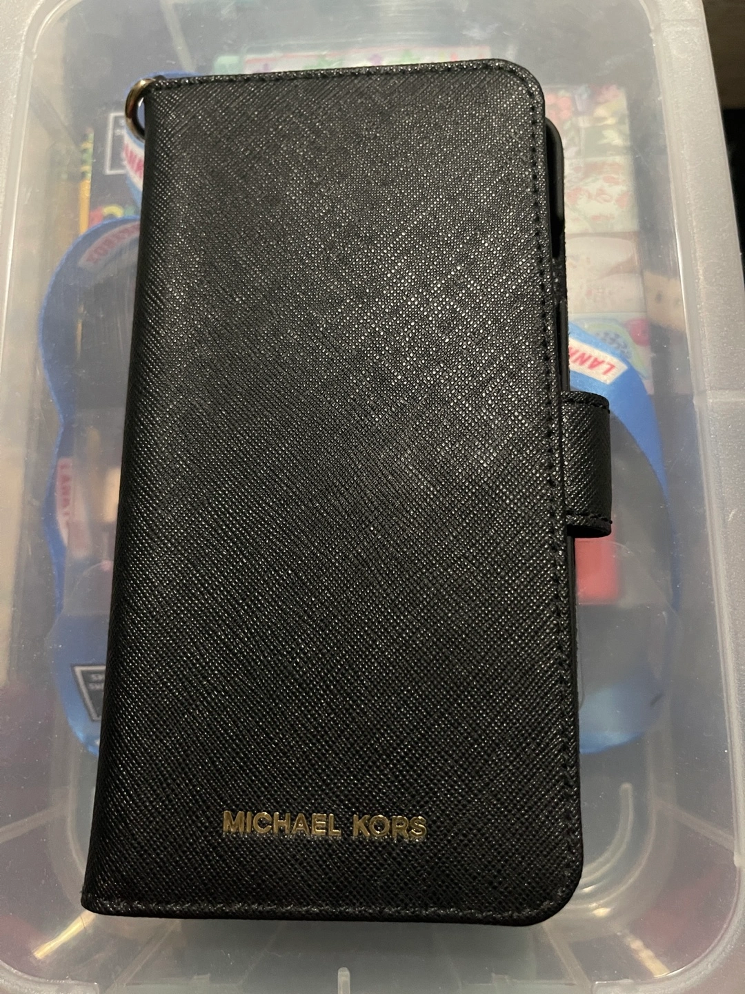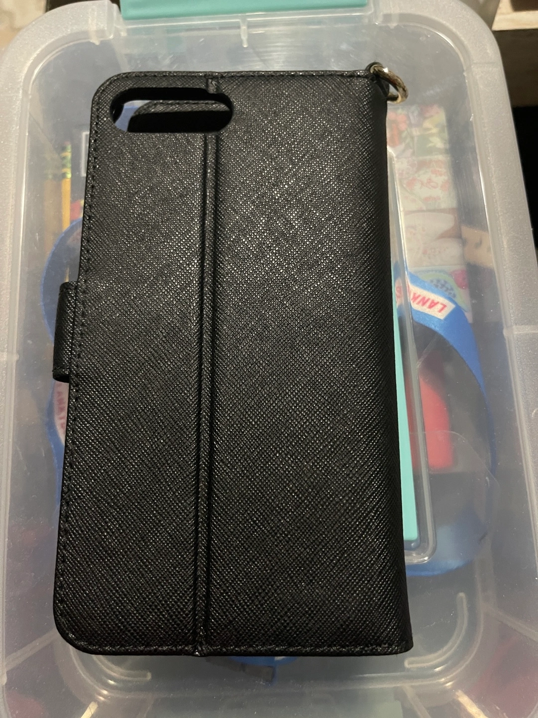 99Black leather iPhone wallet case. Features card slots and wristlet strap. Good condition.