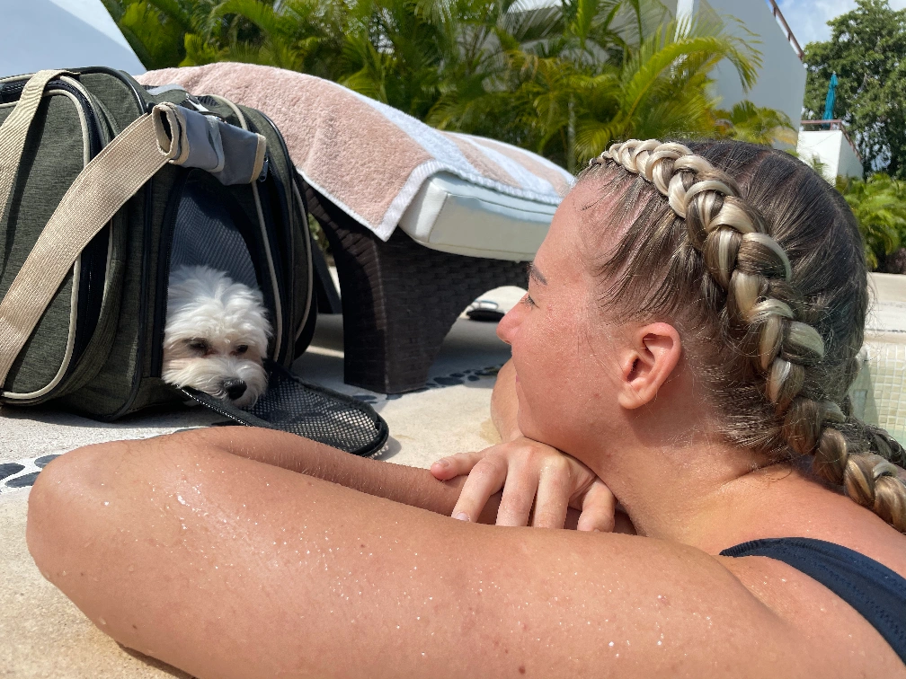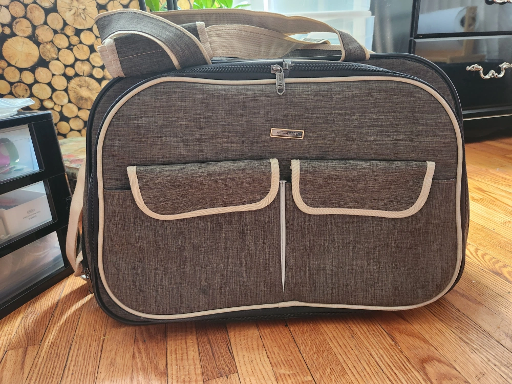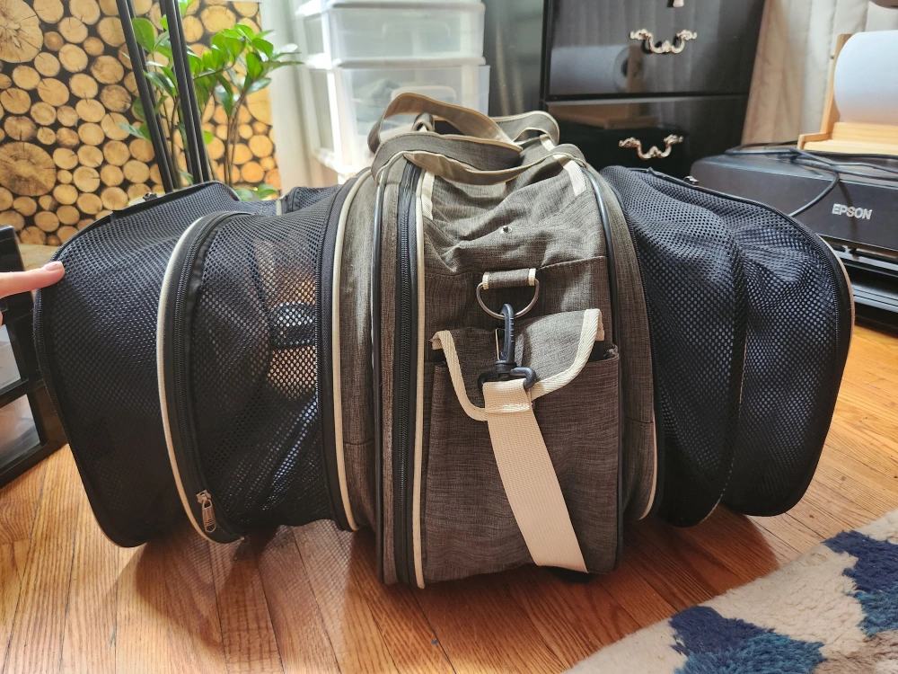 280dark green pet carrier. Expandable design. Multiple zippered compartments. Shoulder strap and top handle. Great for travel.