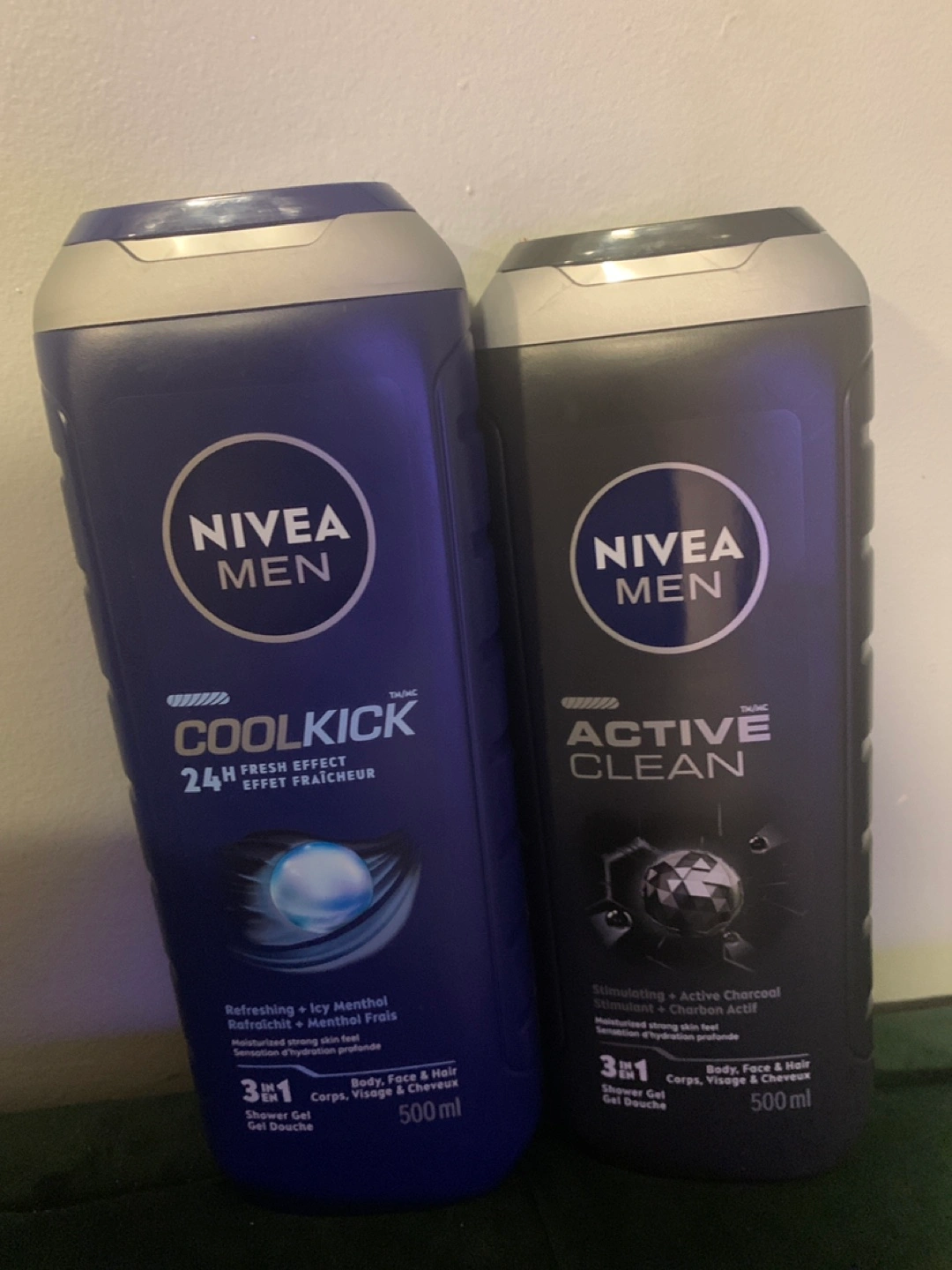 NIVEA MEN shower gel, 500ml bottles. Multiple scents available: Rock Salts, Energy, Active Clean, and Coolkick. 3-in-1 formula for body, face, and hair.