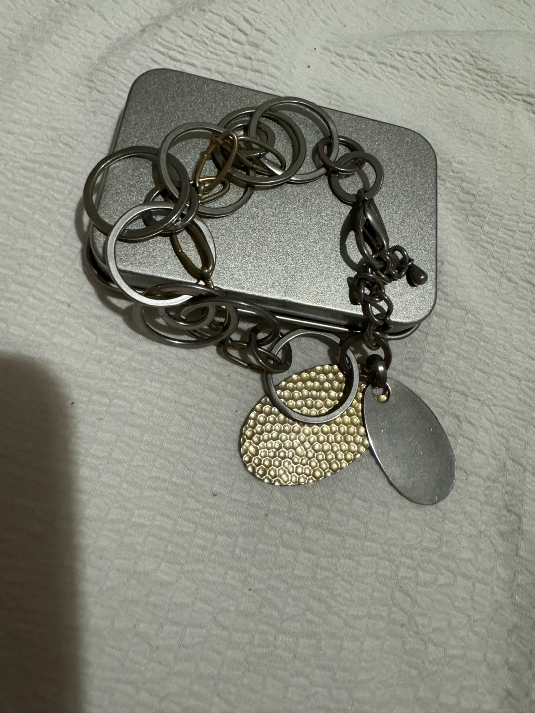 128Unique bracelet featuring interconnected metal rings and two oval charms. Gunmetal and gold tones. Comes in a tin.