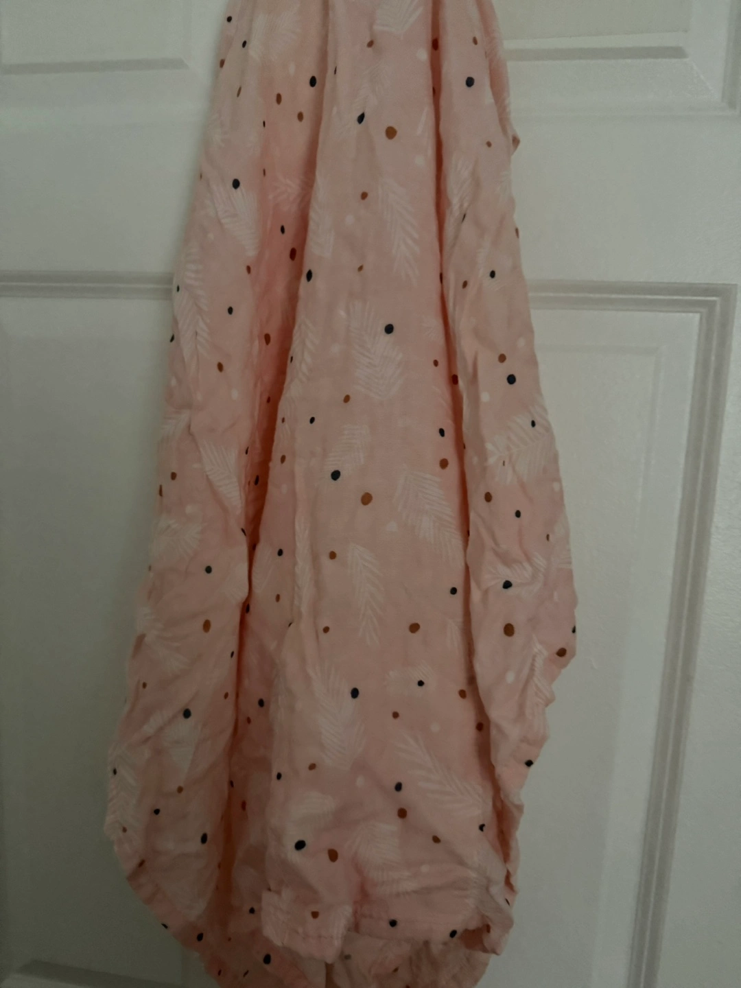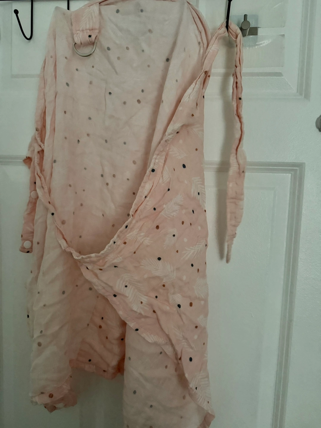Lightweight muslin baby wrap. Features a pretty pink and white leaf and dot pattern. Great for nursing or swaddling. Soft and breathable material.