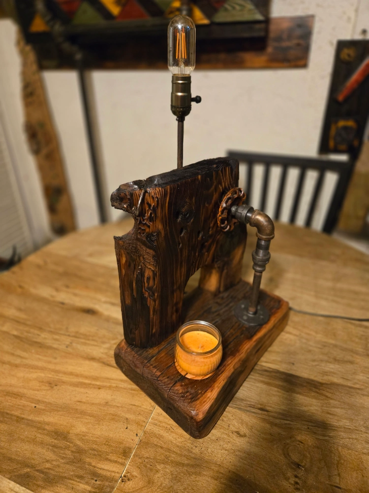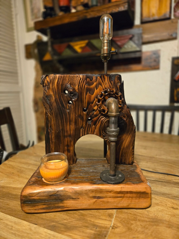 Unique table lamp. Features reclaimed wood, industrial pipe accents, and a vintage Edison bulb. Includes a small candle holder. Perfect for a rustic or industrial-style home.