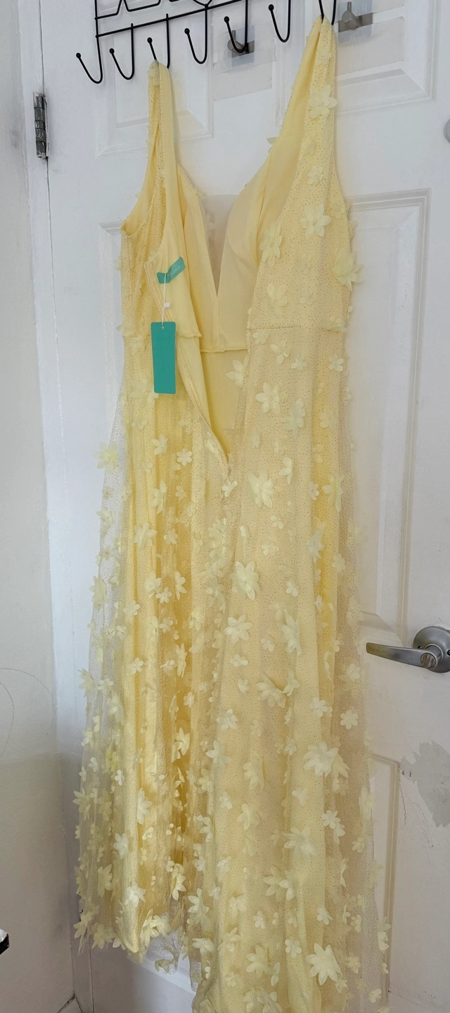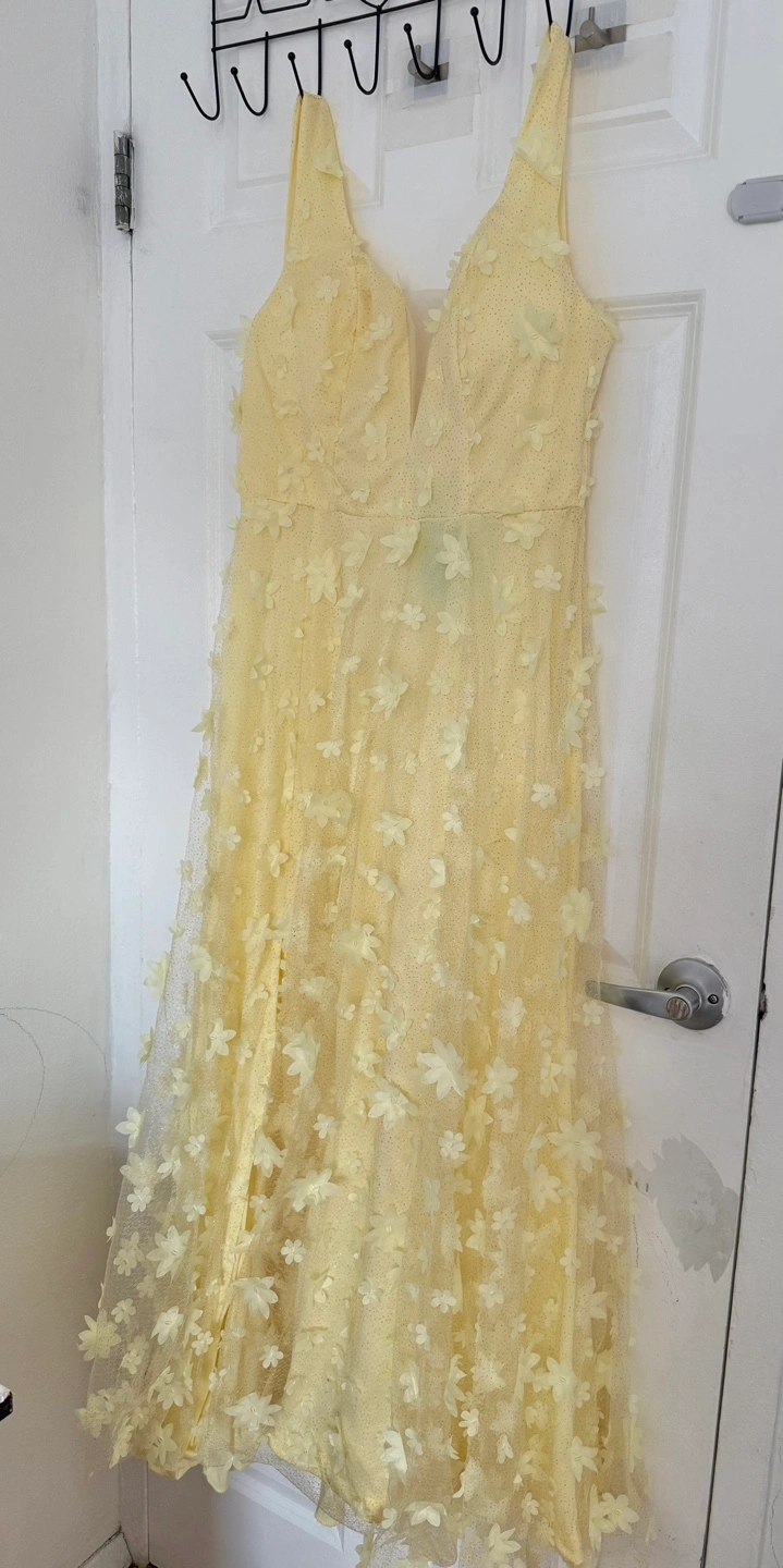 Beautiful yellow maxi dress. Features a V-neck and flower appliques. Flowy and elegant. Perfect for a special occasion.