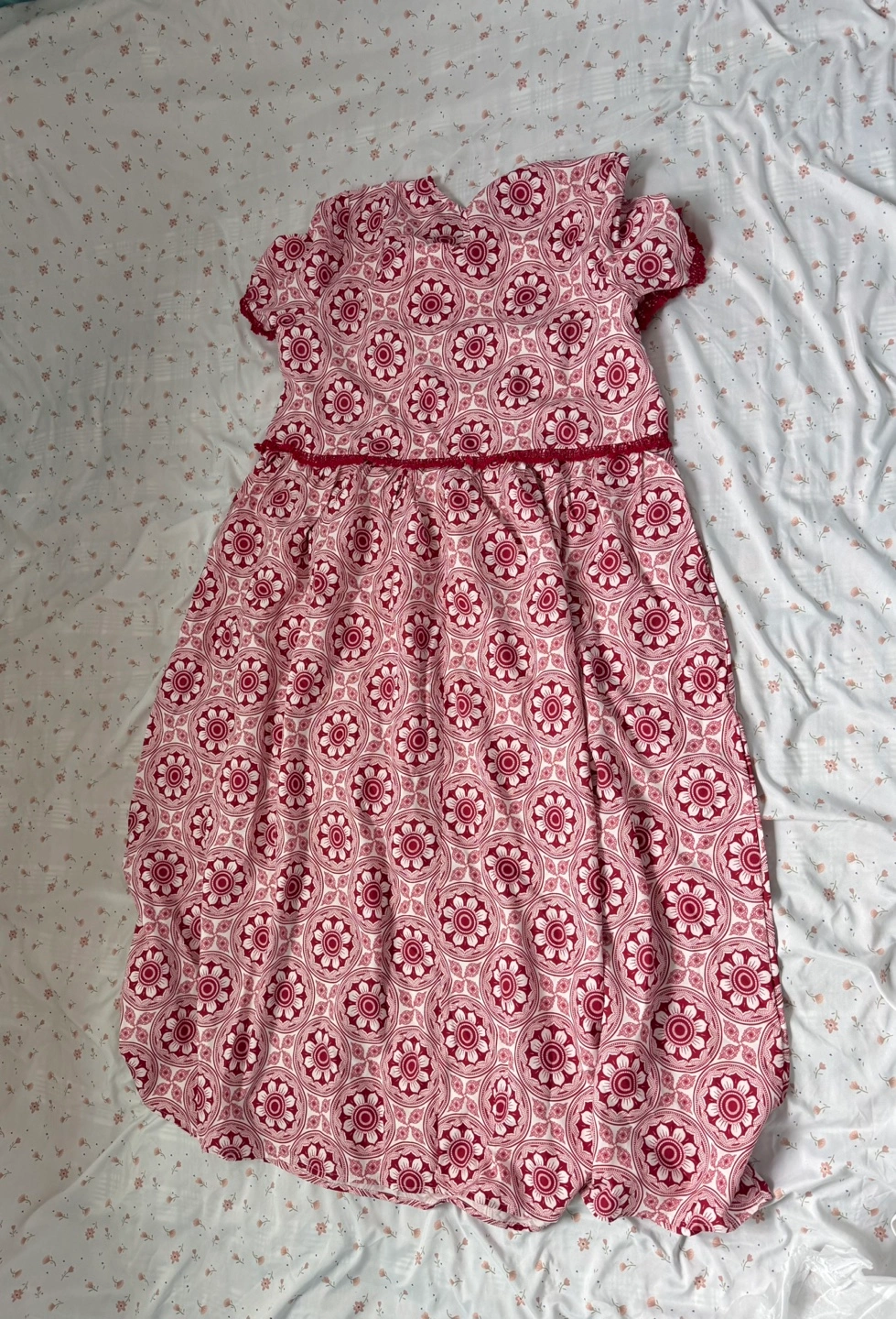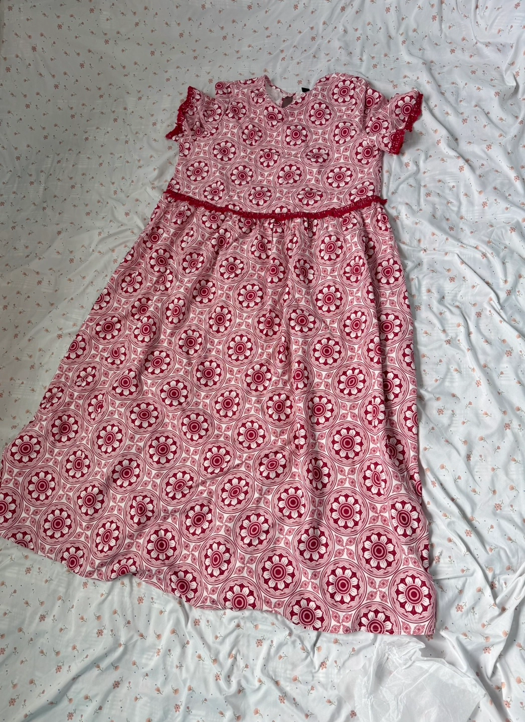 Beautiful maxi dress. Polyester fabric which features a red and white floral print. Short sleeves and a flowy skirt. Perfect for summer.