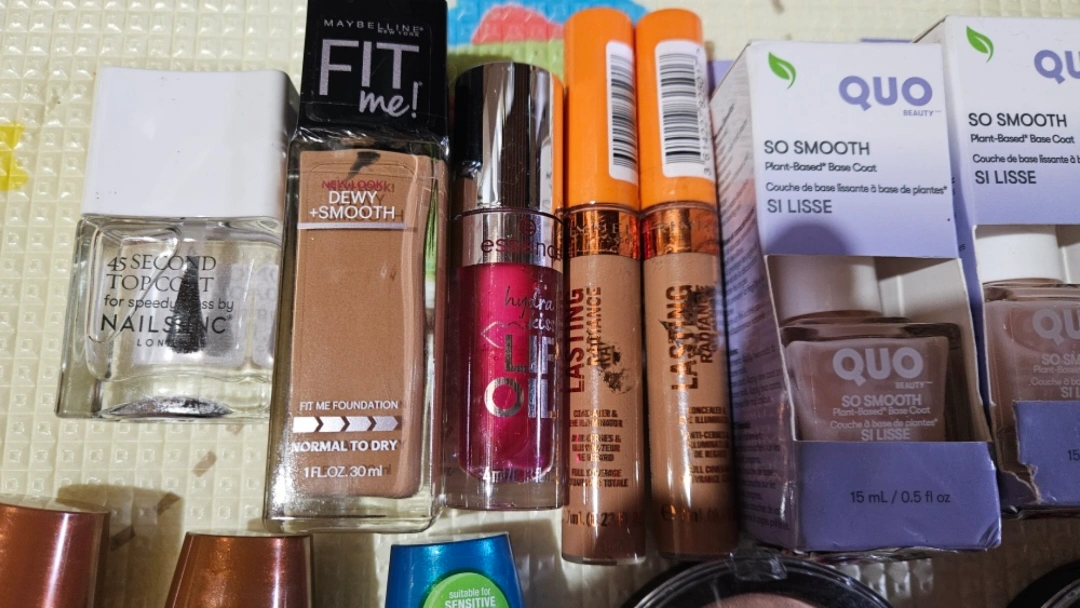 Large bundle of makeup, including foundation, concealer, nail polish, and more. Various brands and shades. Perfect for experimenting or replenishing your collection. Check pictures for details.