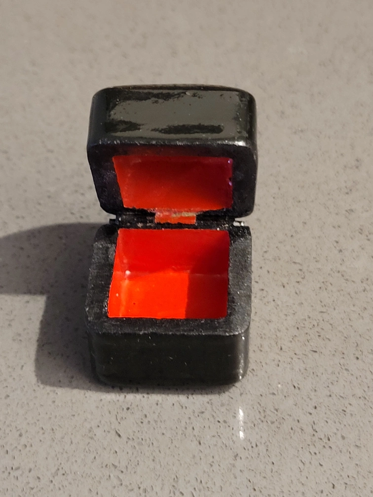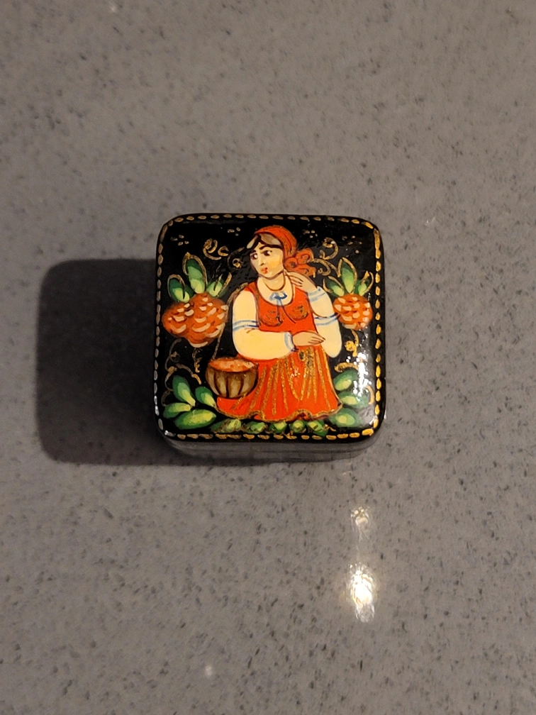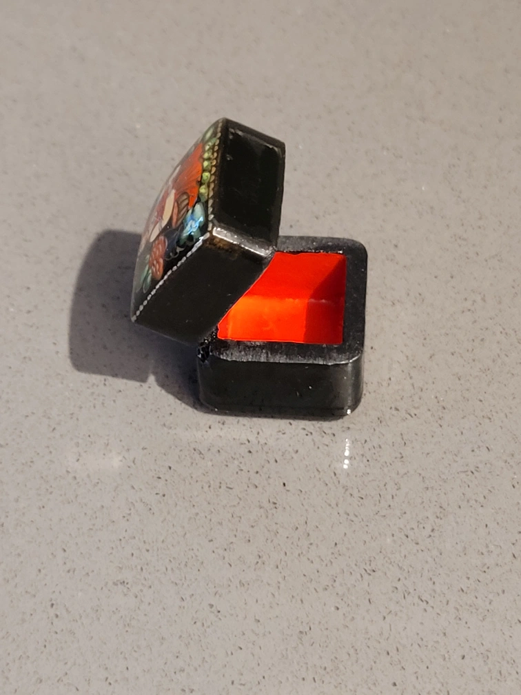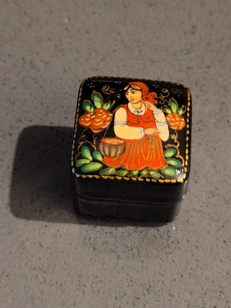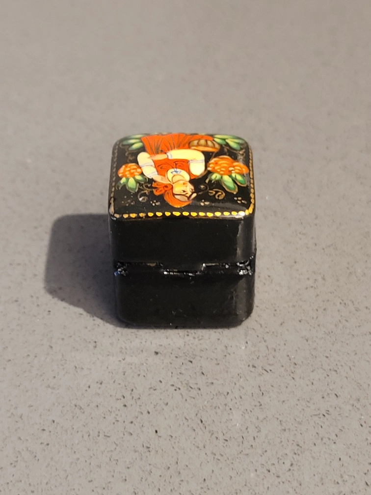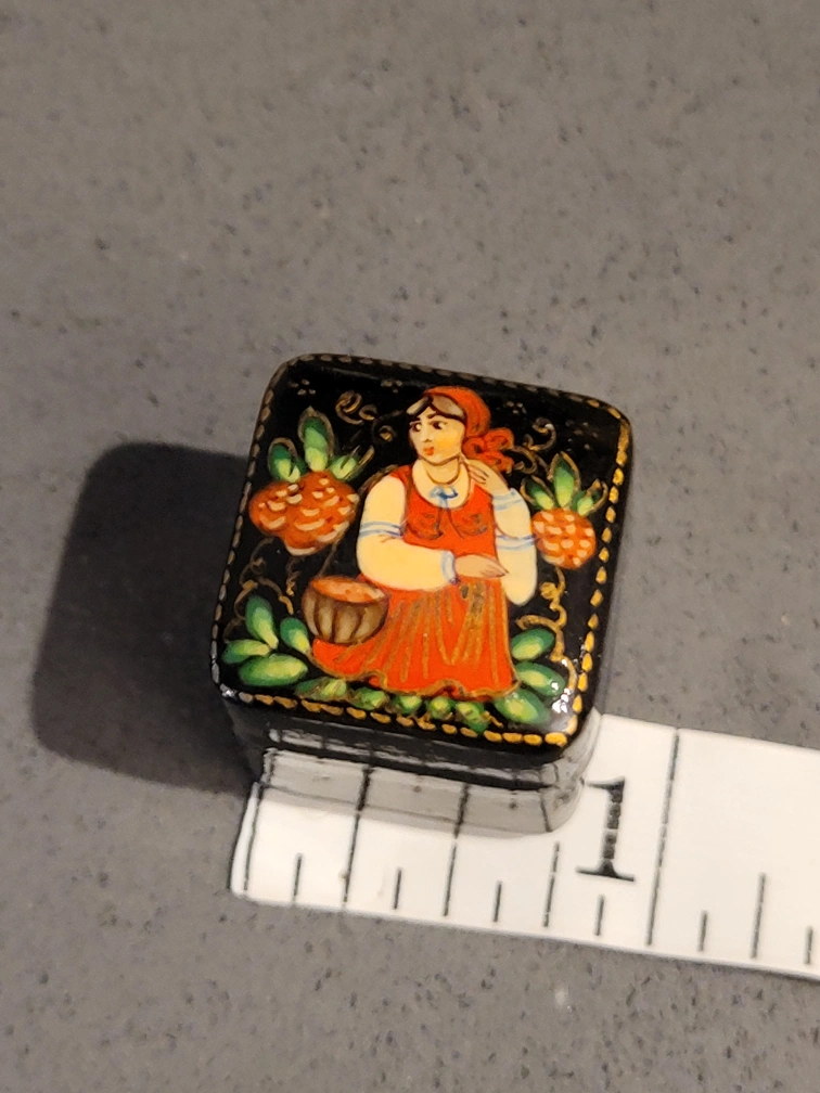 Tiny square black box. Features a hand-painted scene of a woman. Red interior. Perfect for trinkets or jewelry. Approximately 3/4"L x 3/4" W Feel free to check out my other unique items listed.