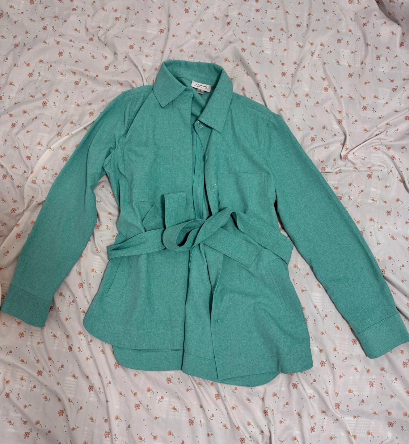 Mint green button-down shirt jacket. Long sleeves, belted waist. Two chest pockets. Lightweight material.