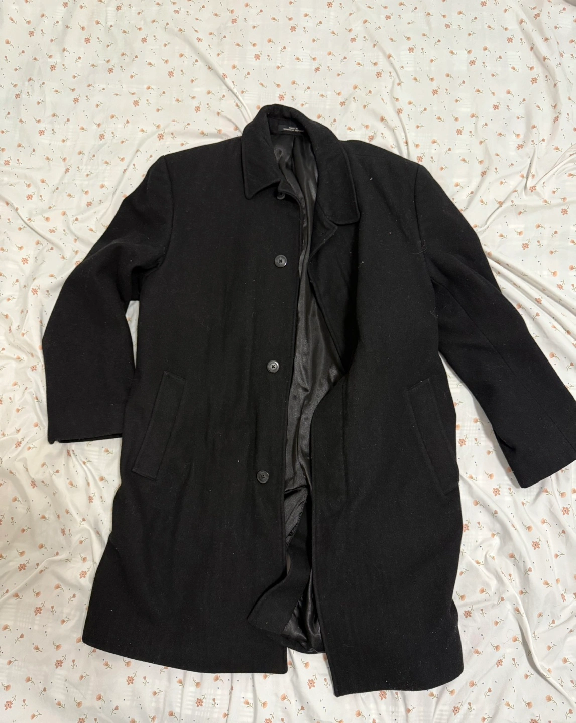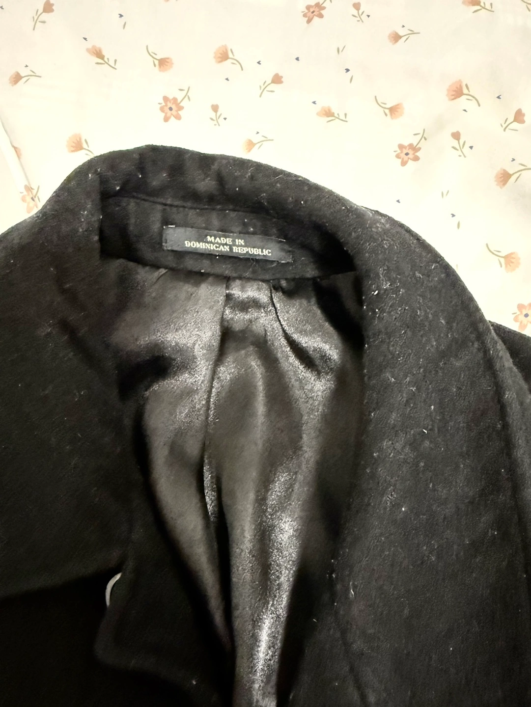 Classic black wool overcoat. Long sleeves, button closure. Made in Dominican Republic. Good for fall and winter.