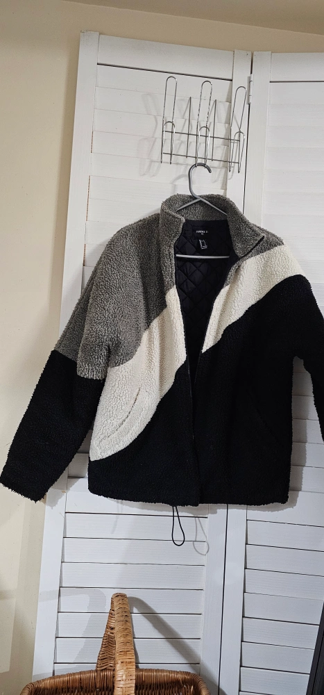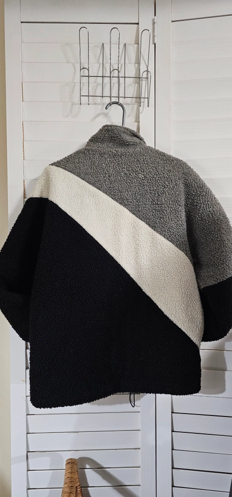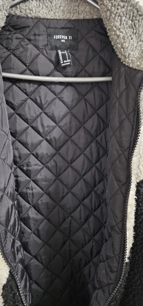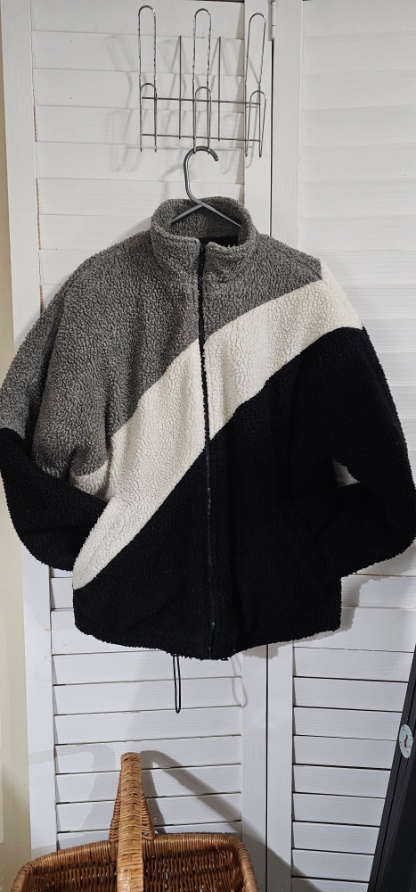 1000+In very good condition. Men's zip-up fleece jacket. Colour-block design. Grey, white, and black. Quilted lining. Size S