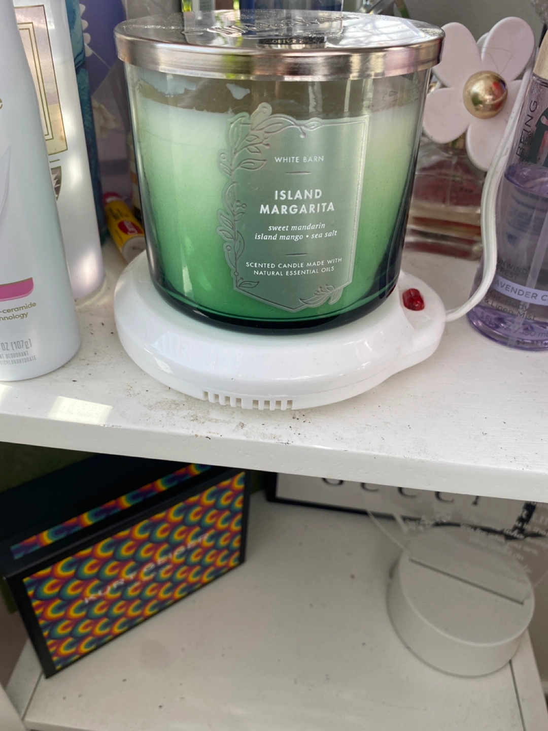 Scented candle, green glass jar, metal lid. Sweet mandarin, island mango, sea salt scent. Comes with candle warmer.