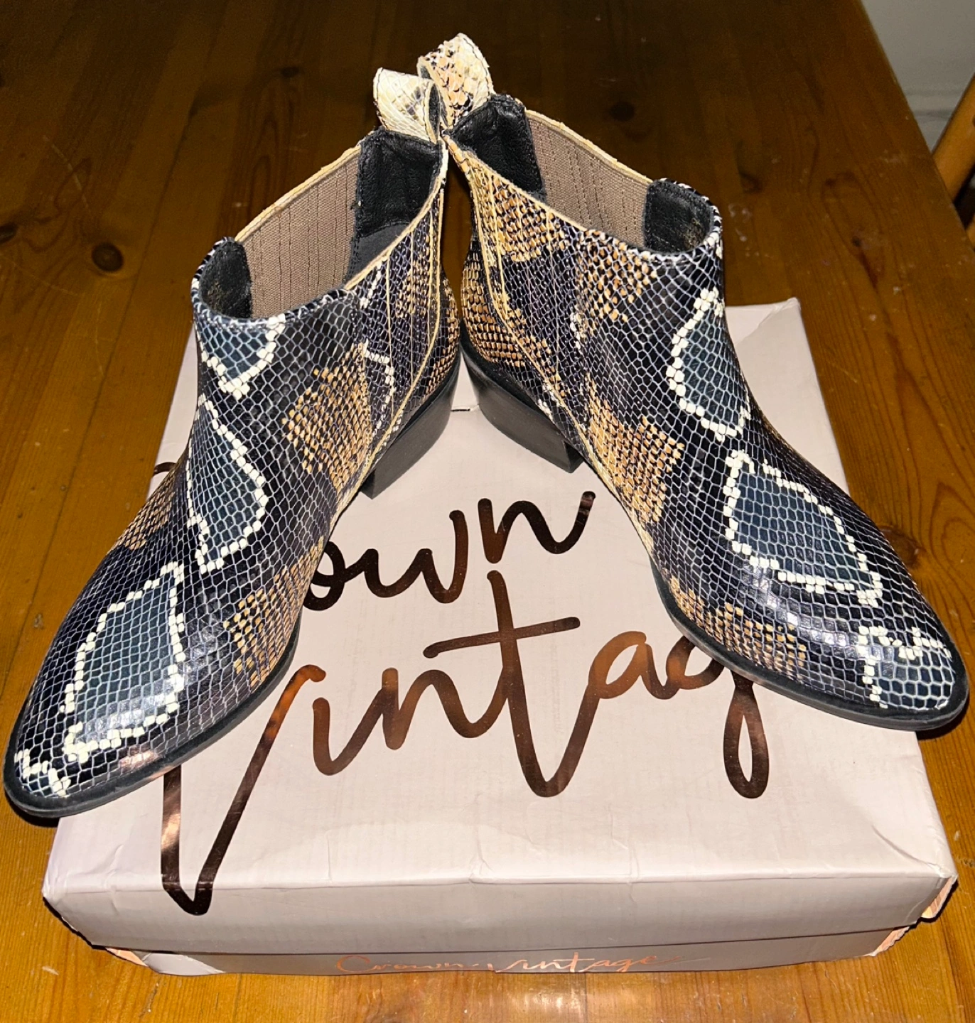 1000+Women's snake print Chelsea Tolana ankle boots from Crown Vintage. Western style. Low block heel. New in box. Original MSRP: $120
