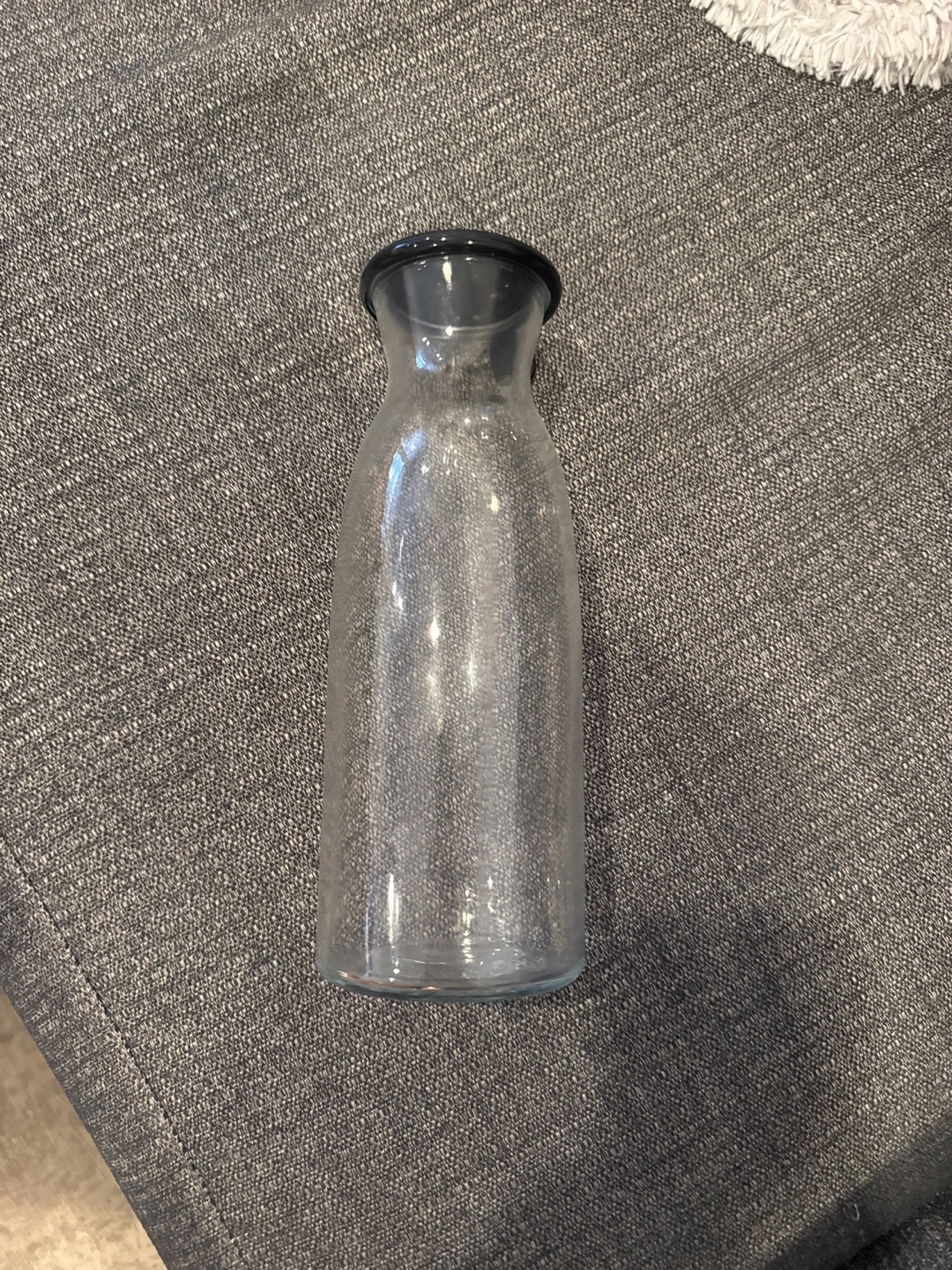 Clear glass beverage dispenser. Black plastic lid. Perfect for water, juice, or other drinks. Sleek and simple design.