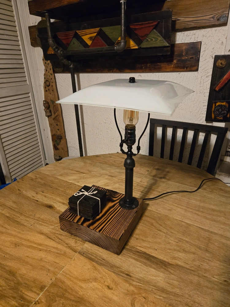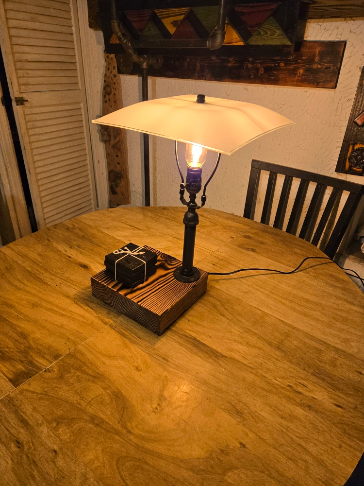 Unique handcrafted lamp. Features a metal pipe design and a white shade. Sits on a dark stained wood base. Includes a set of dark wood coasters.