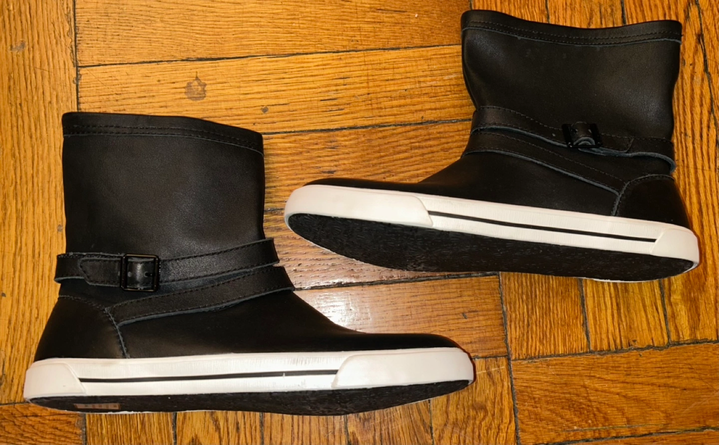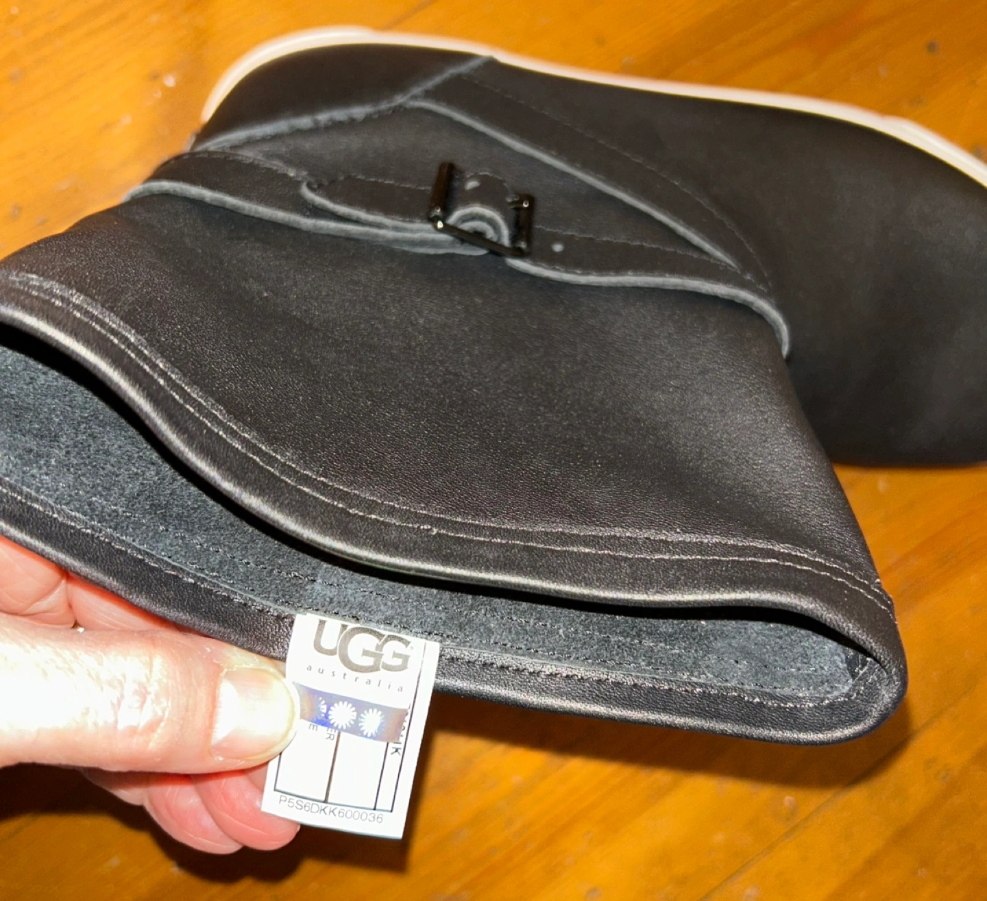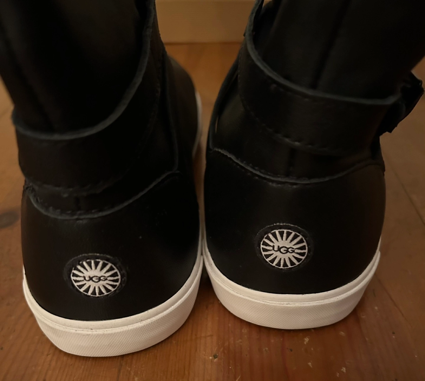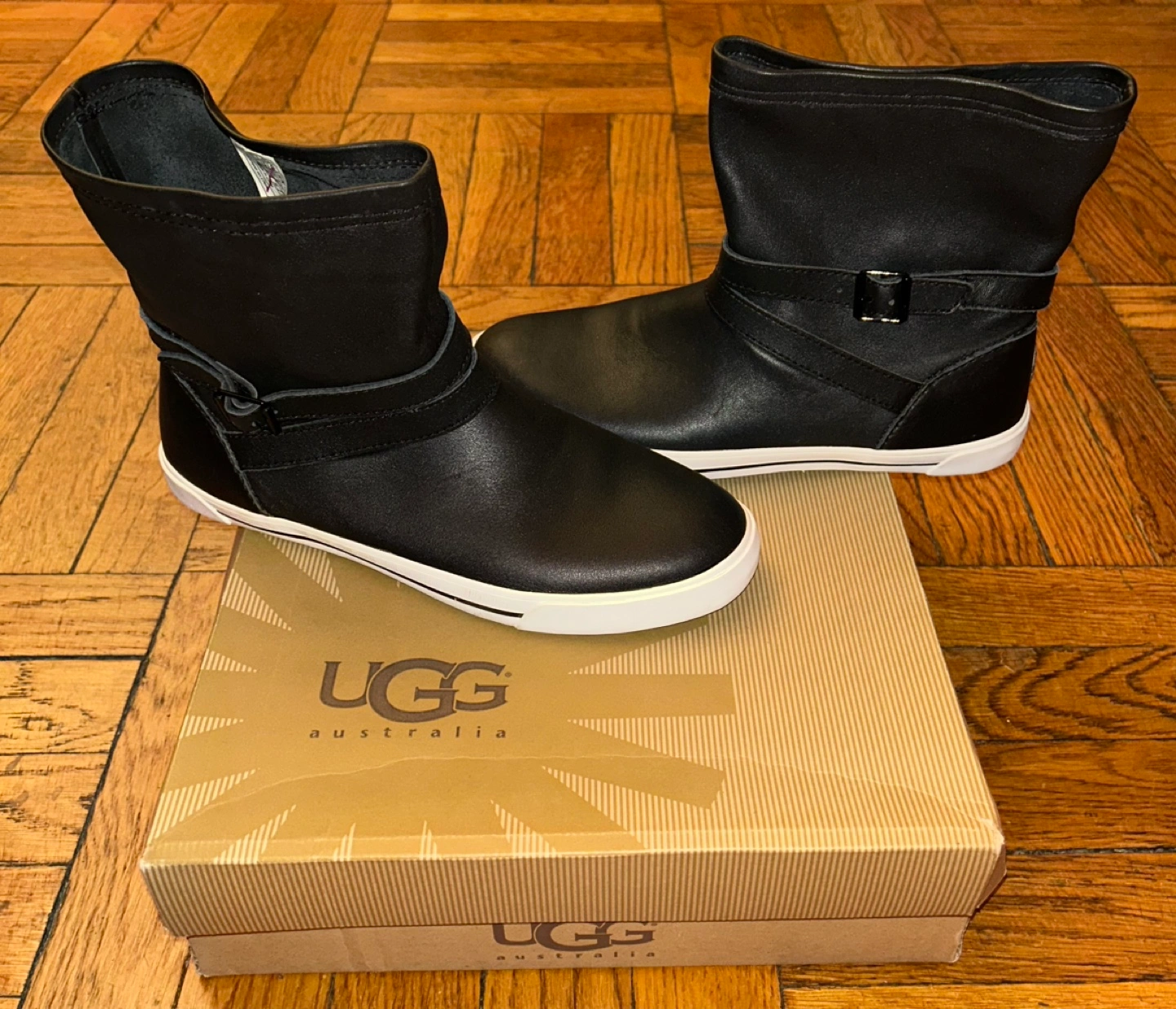 1000+Black leather ankle boots from UGG. Slip-on. Buckle detail. White soles. Comes with original box. New; never worn.