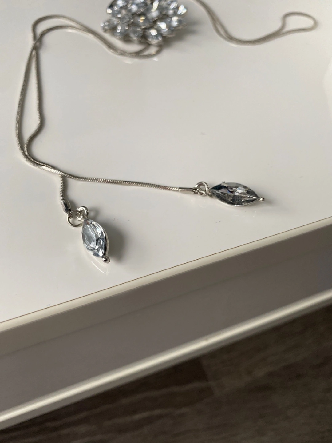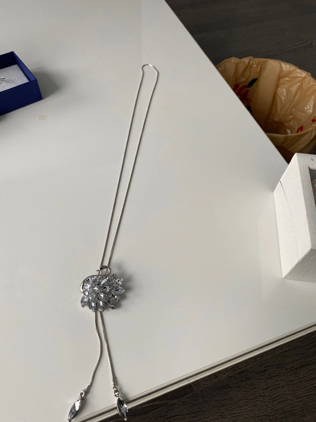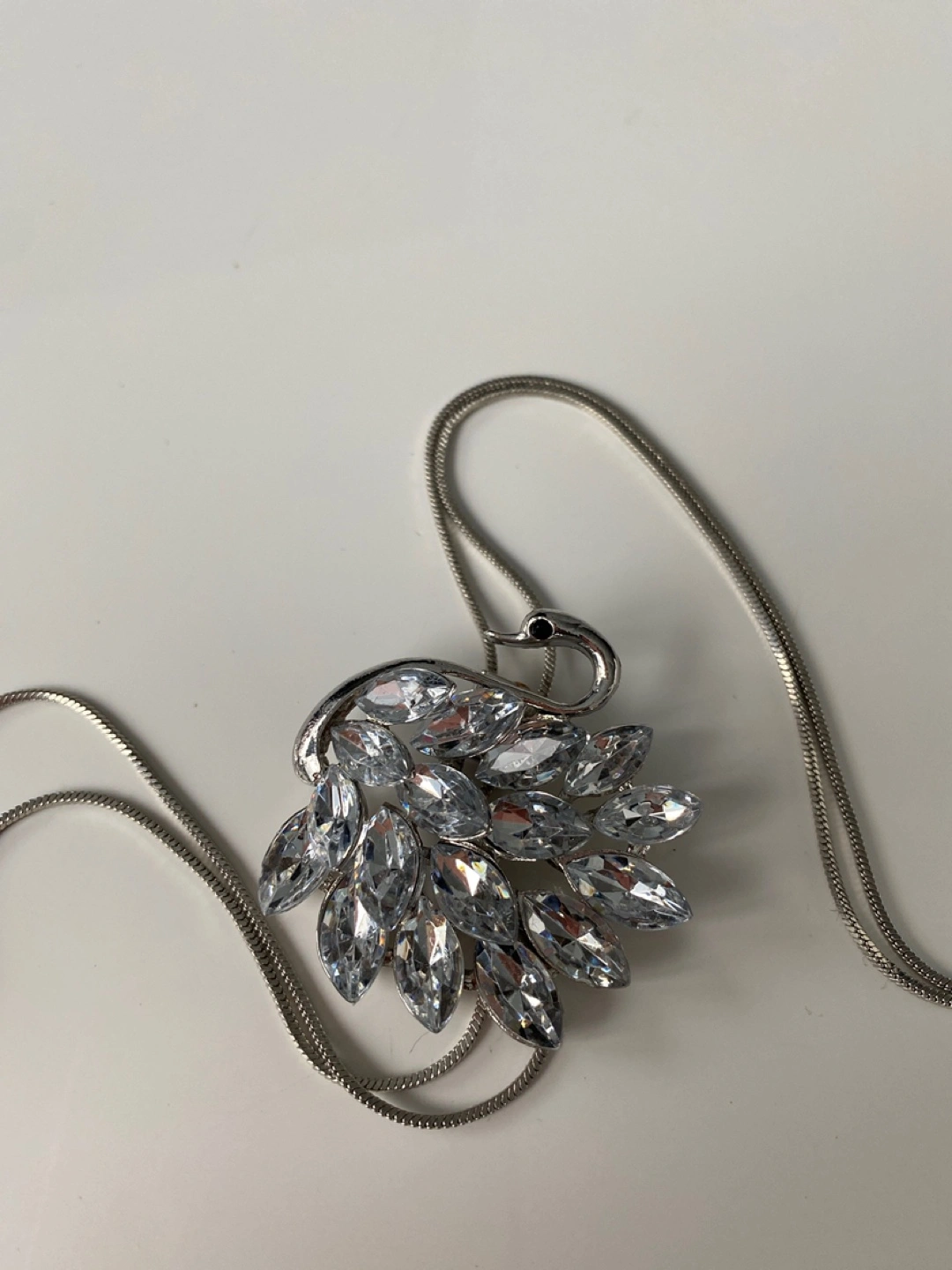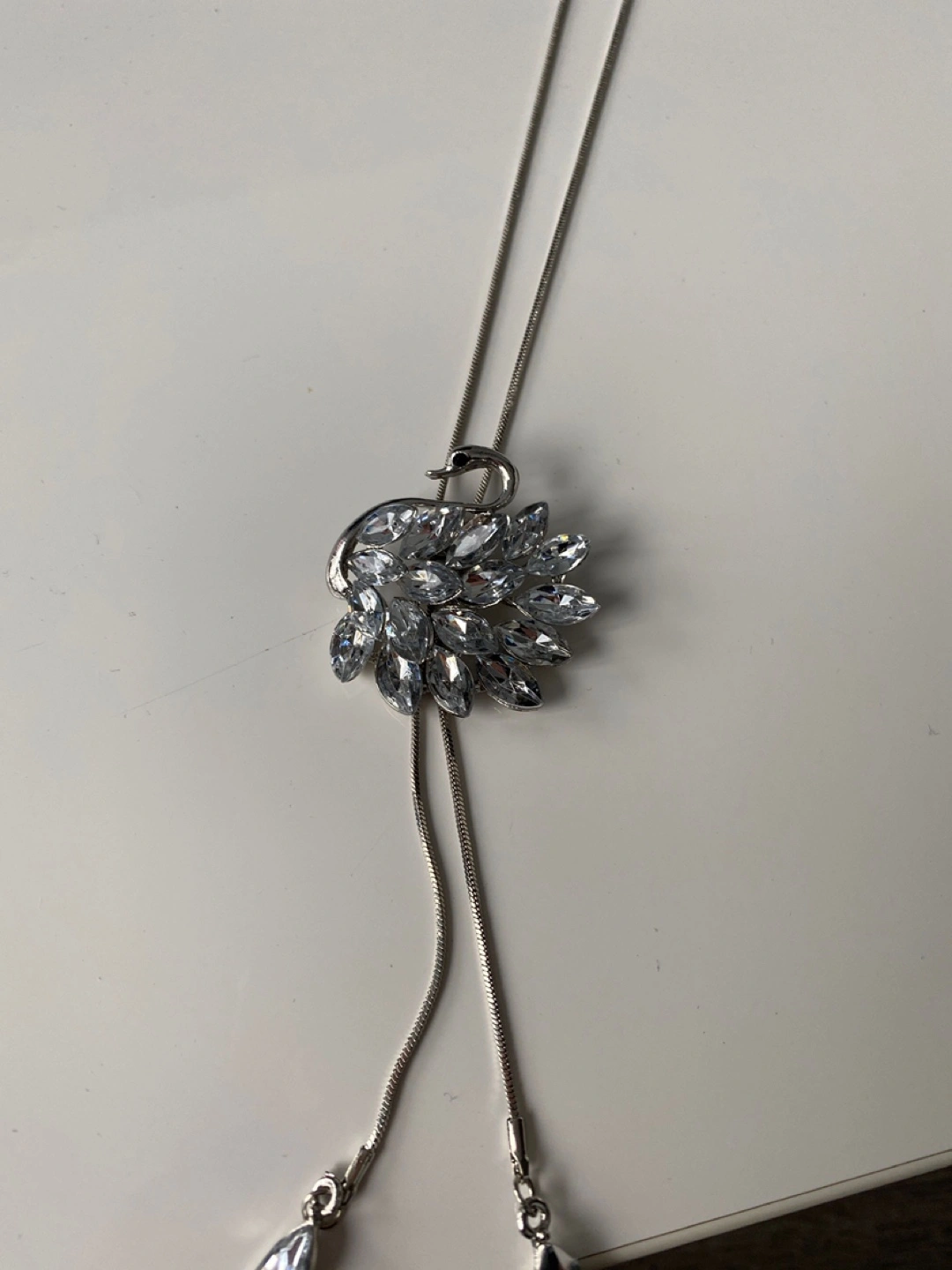 Beautiful silver-tone lariat necklace. Features a swan-shaped pendant adorned with sparkling clear crystals. Long chain with two dangling crystal accents. Perfect for adding a touch of glamour to any outfit.