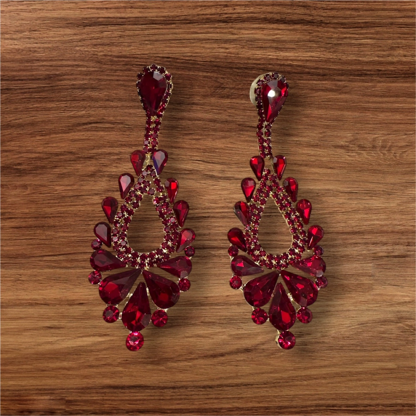 Stunning pair of long red crystal earrings. Gold-tone metal. Perfect for a special occasion.
