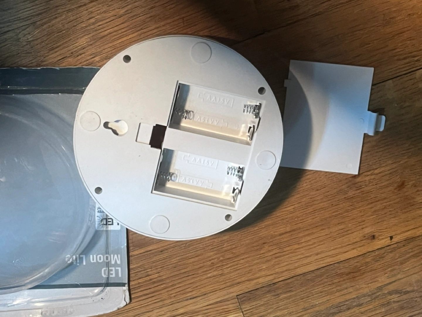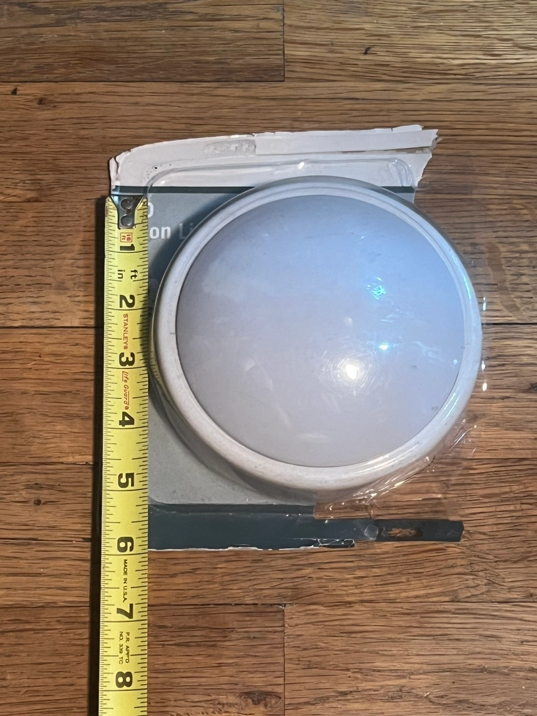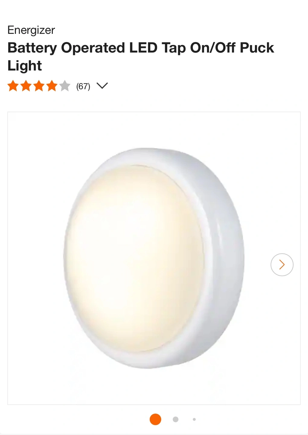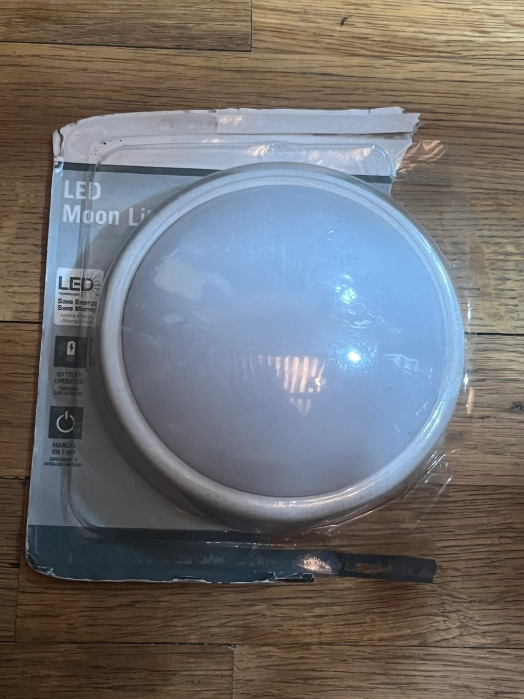 Battery operated LED 5” puck light. Tap on/off. White plastic. New in package, I only need one never used the other. No wiring required, only four AA batteries.
