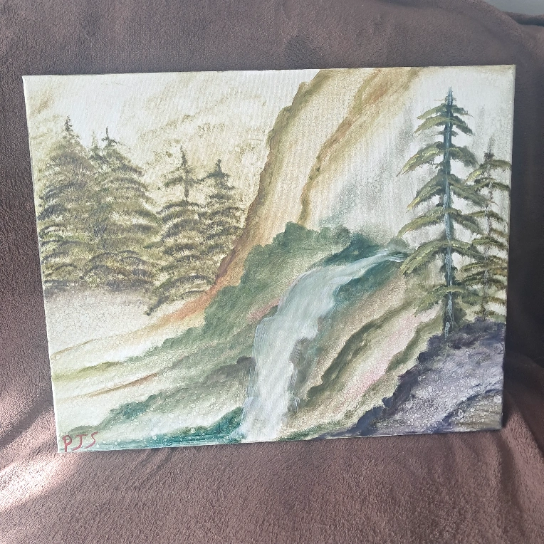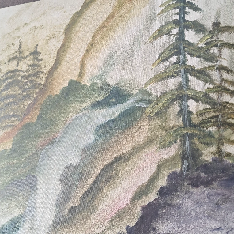 15Hand-painted canvas landscape. Depicts a waterfall cascading down rocky cliffs, surrounded by evergreen trees. Artist signature visible. 16x20