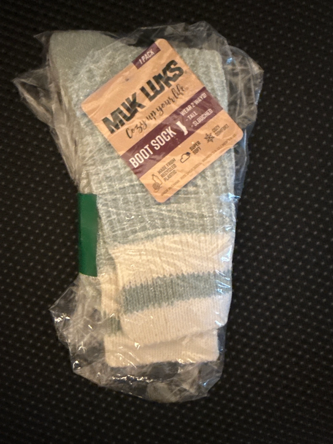 281New Muk Luks boot socks. Cozy and comfortable. Wear two ways: tall or slouched. Made from recycled plastic. Light Blue with sparkle