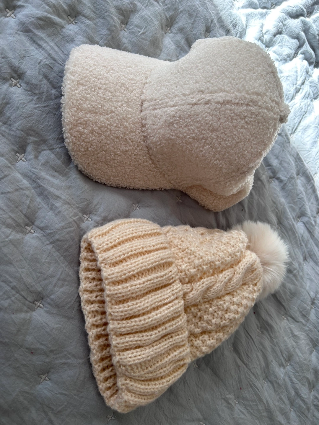 707Adorable set includes a cream-colored cable knit beanie with a fluffy pompom and a sherpa baseball cap. Perfect for winter. Soft and warm.