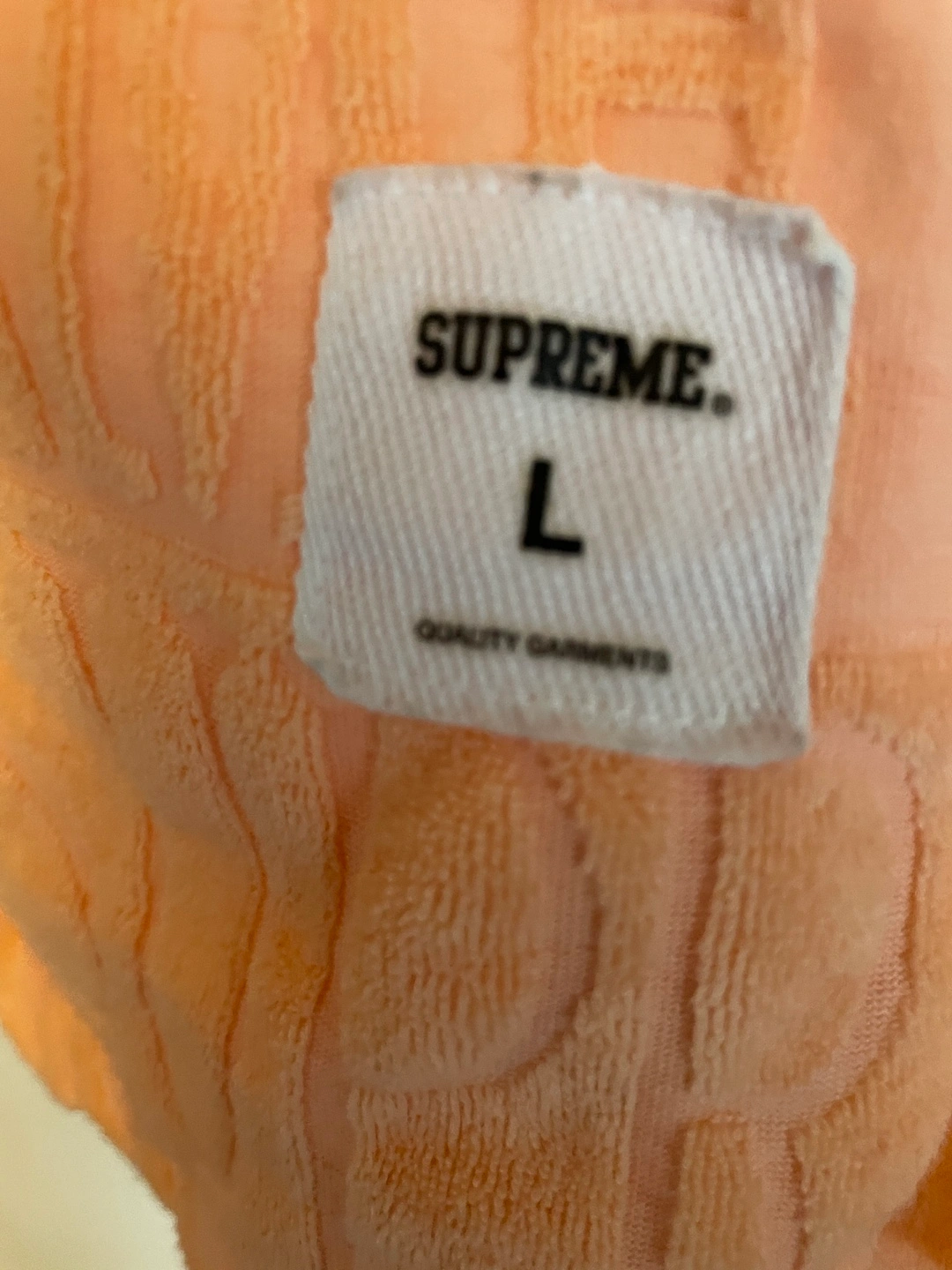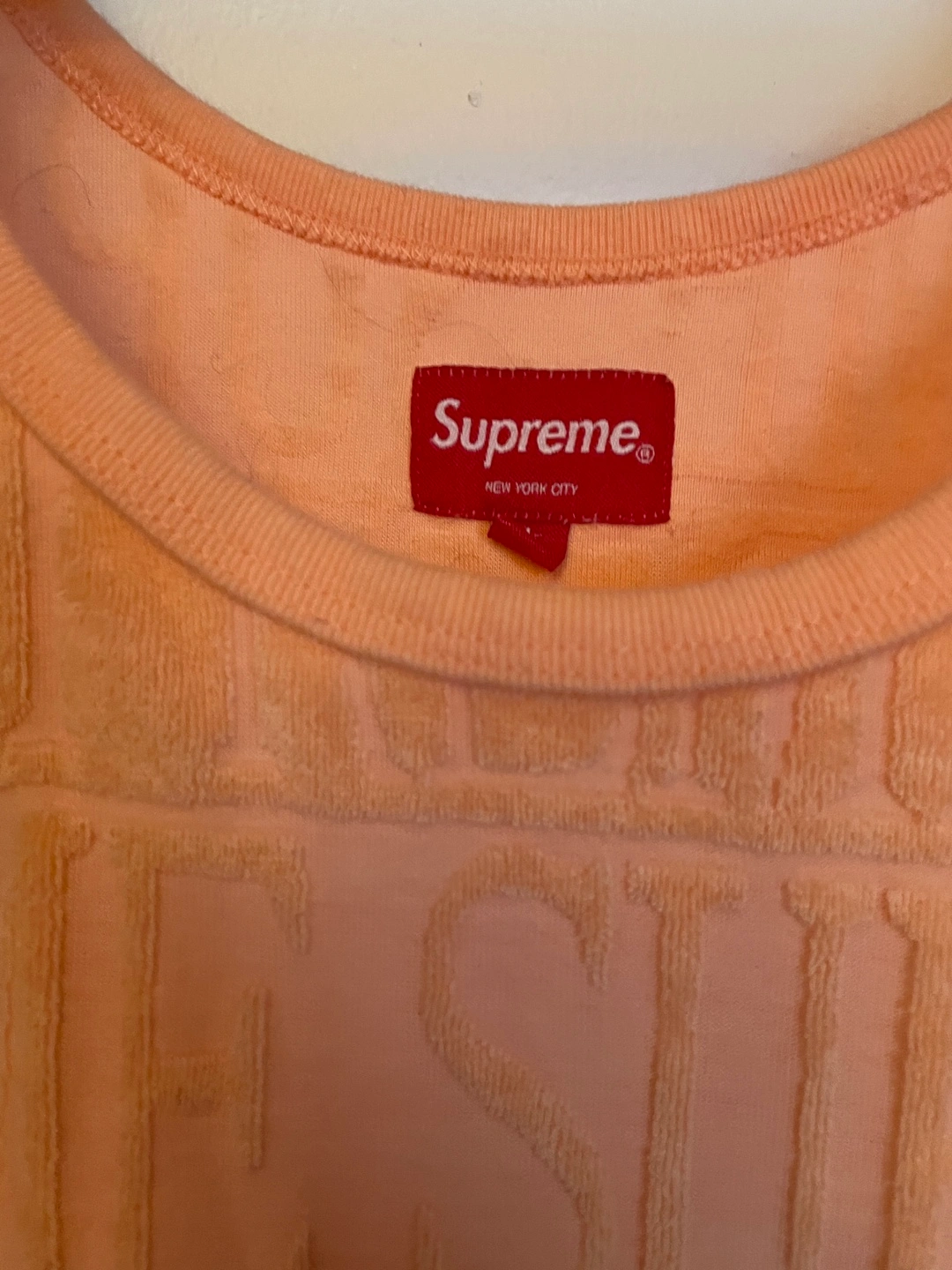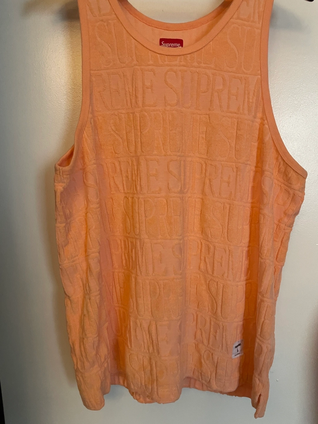 55Men's size large Supreme tank top. Peach color. Textured fabric. Allover Supreme logo.