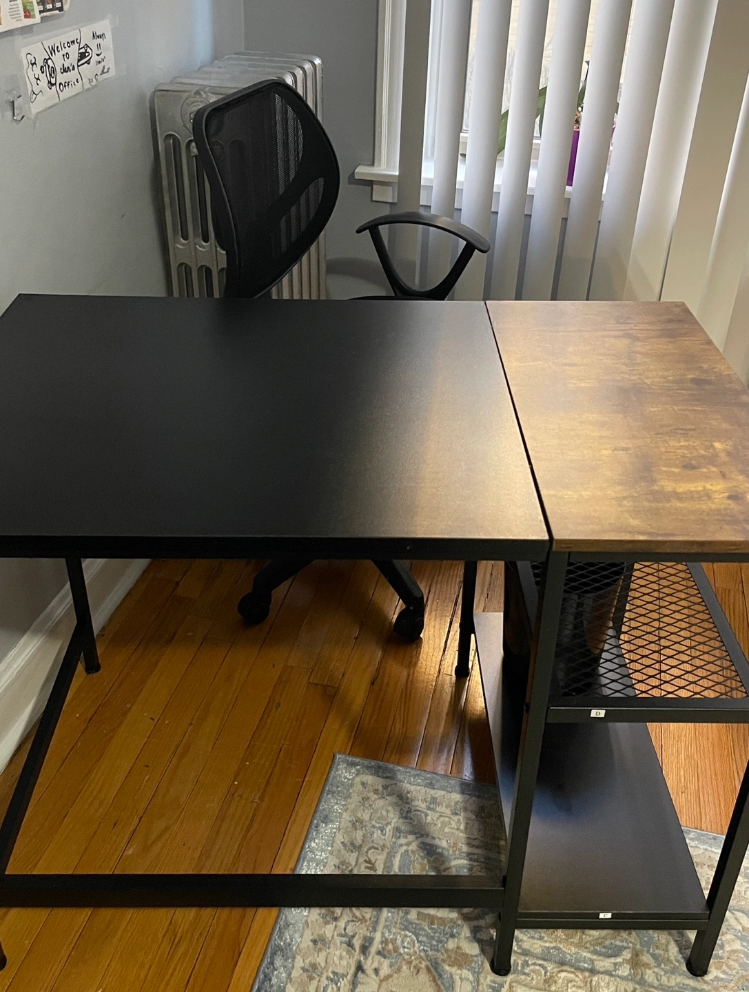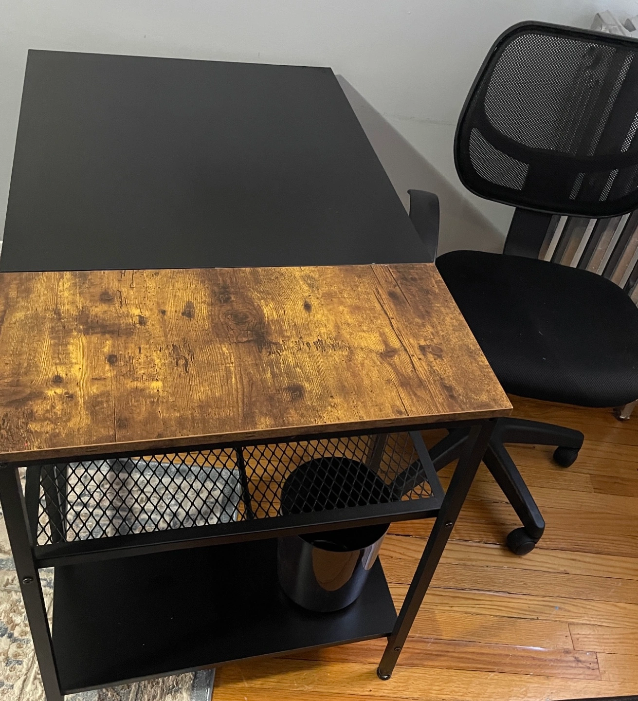 Black metal frame. Two-tone desktop: black and wood grain. Side shelf with metal mesh. Great for home office.