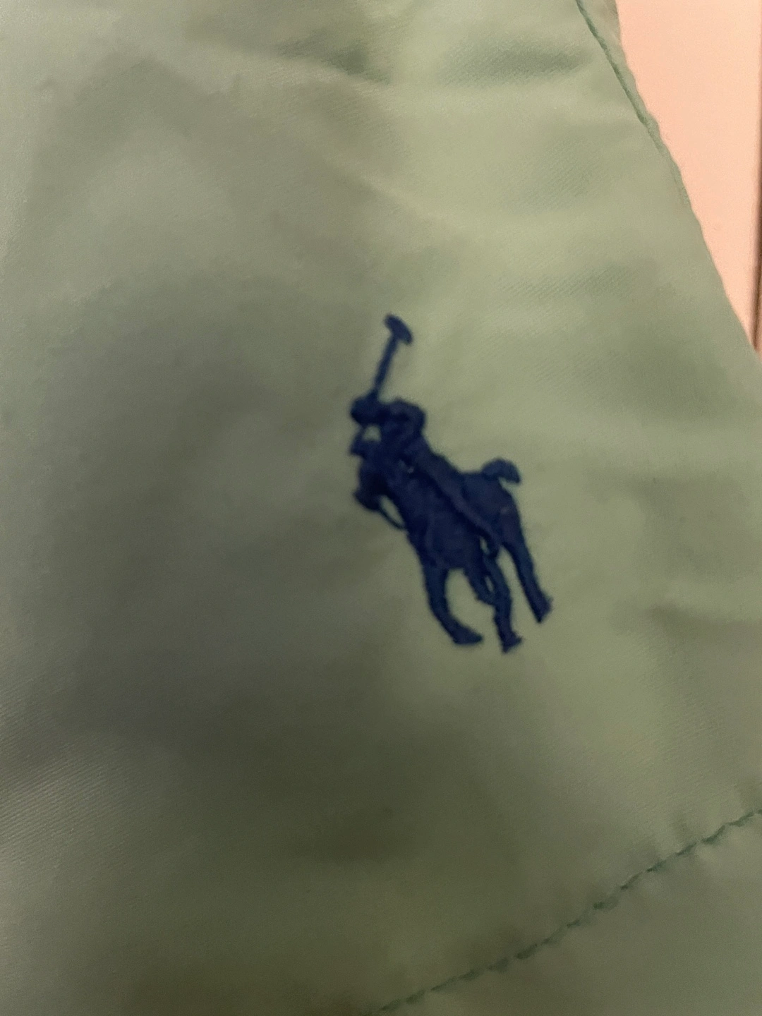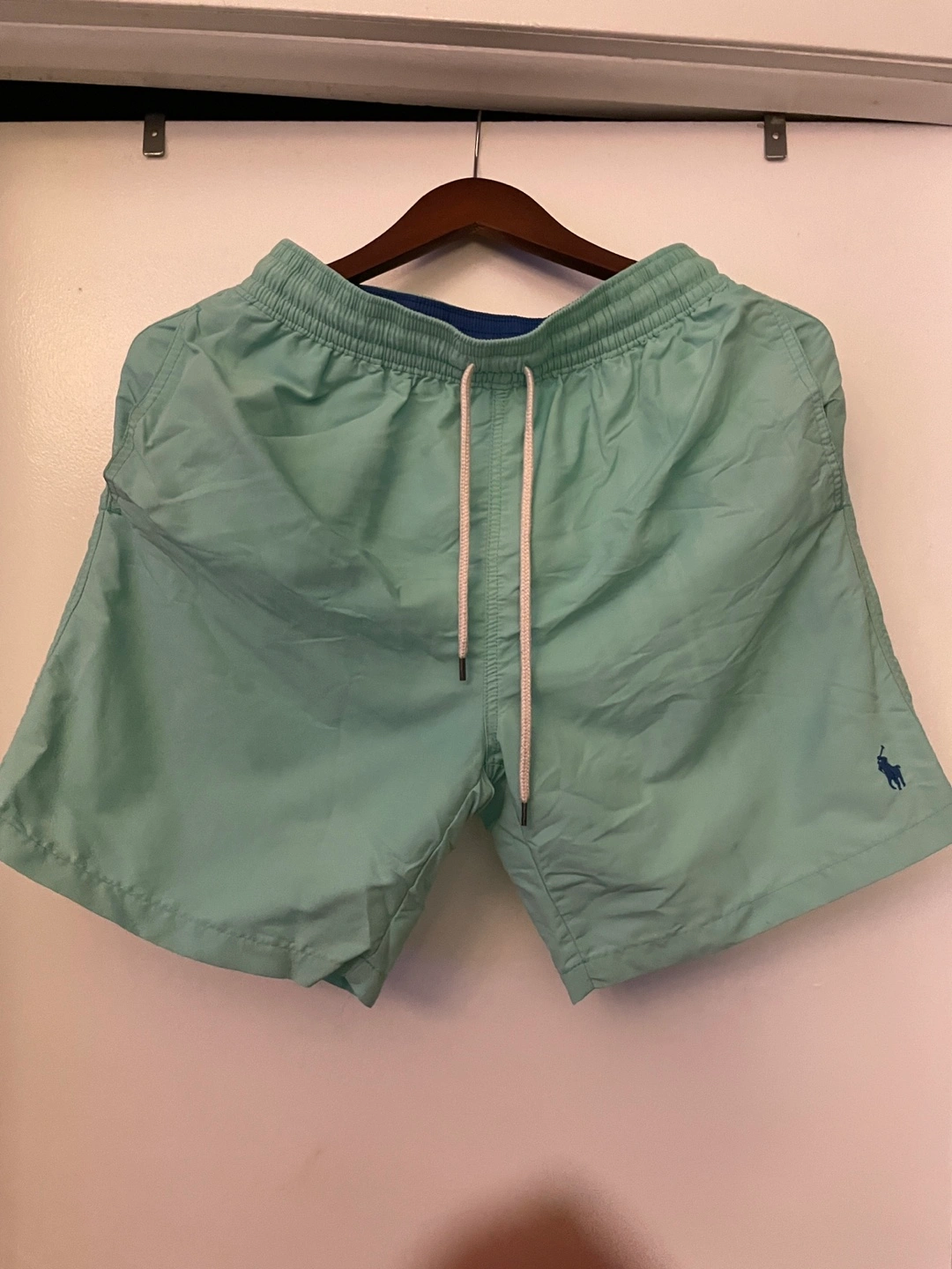 Men's swim trunks. Mint green color. Drawstring waist. Polo Ralph Lauren logo. Great for summer.