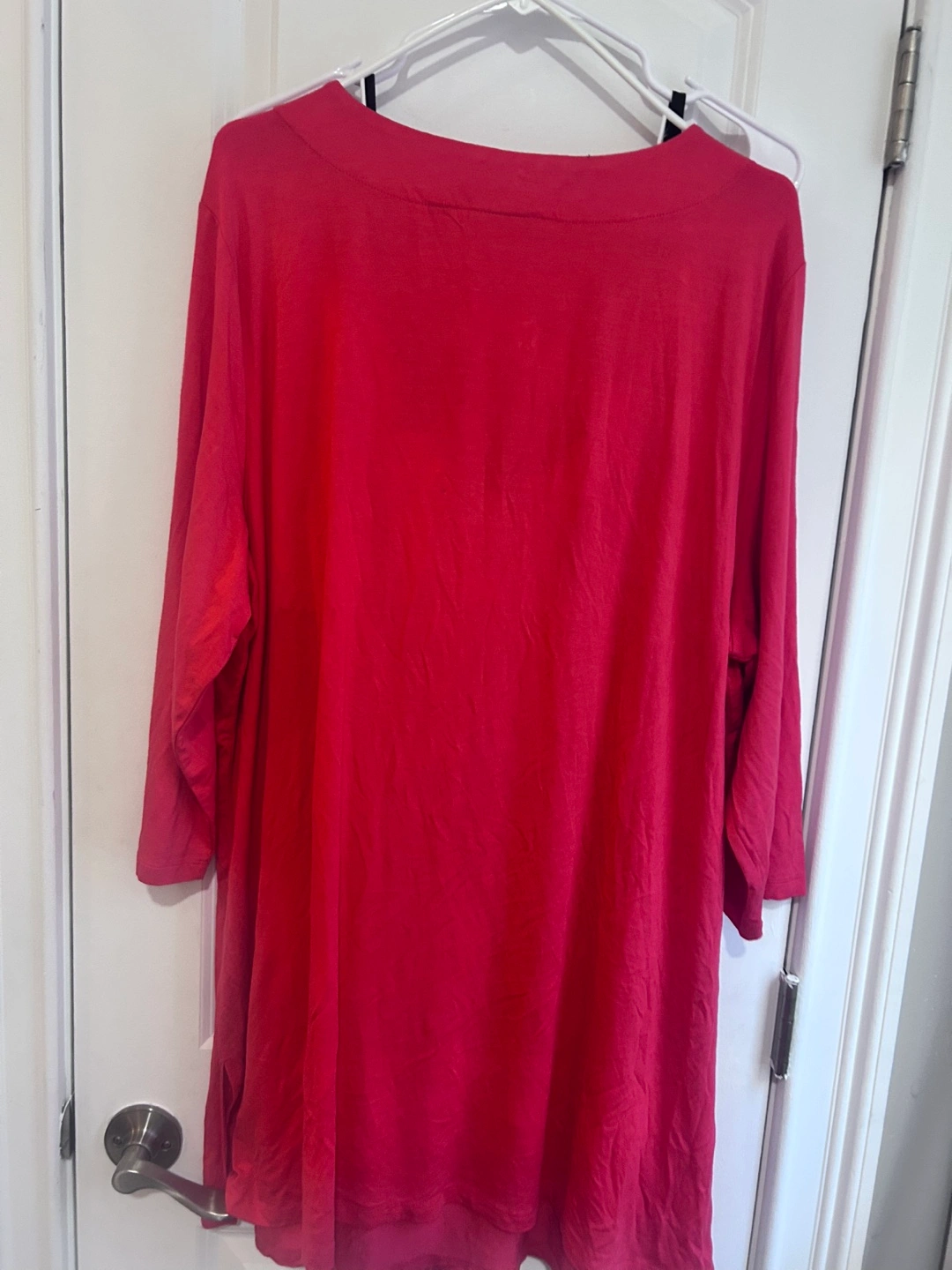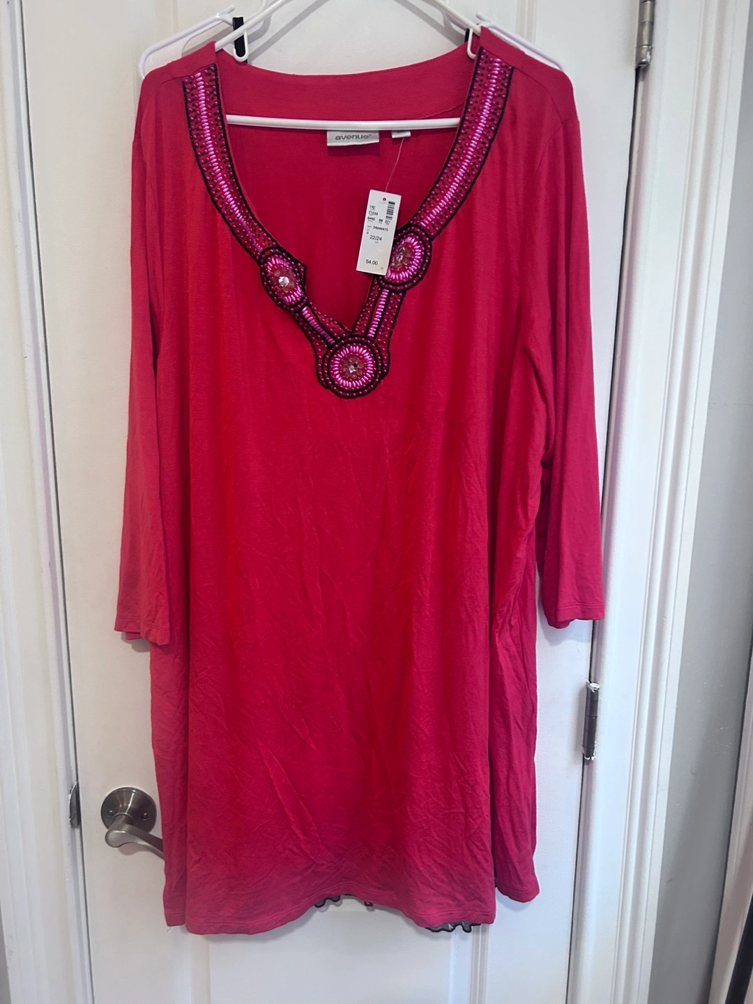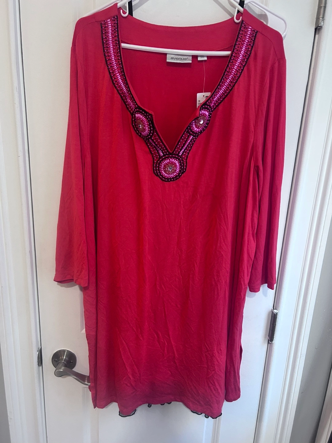 Coral: Red plus size tunic dress , Features a V-neck with beaded embellishments. Three-quarter length sleeves. Layered bottom hem. Looks great with leggings or jeans.