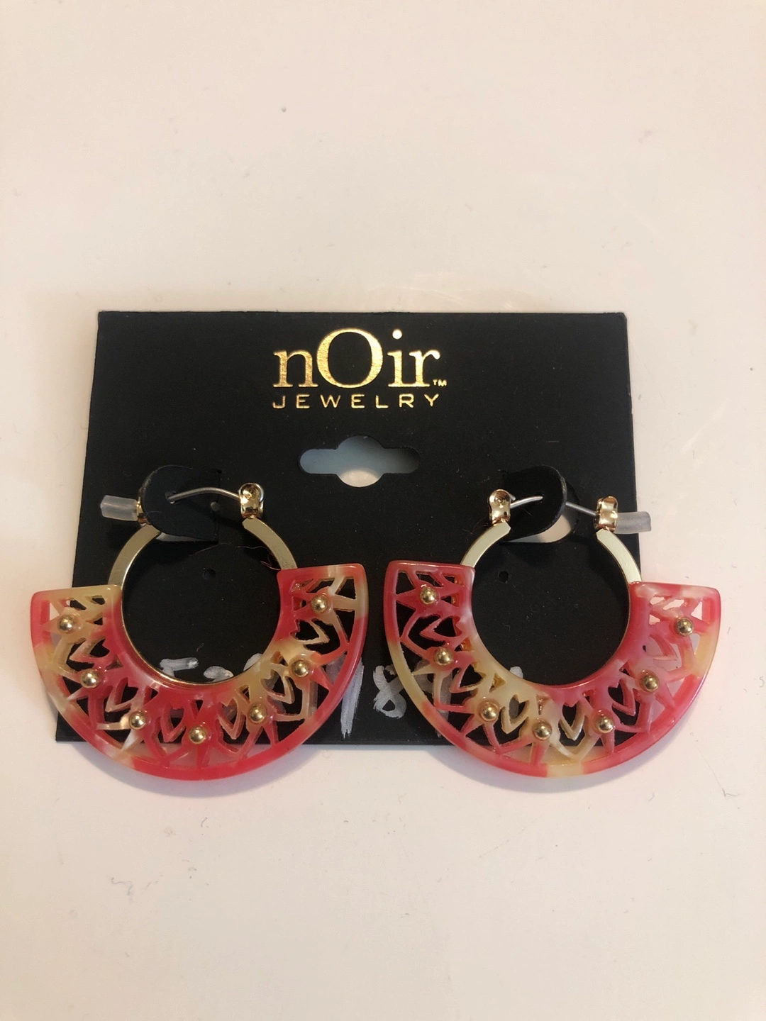 23Pink and gold hoop earrings. Intricate cut-out design. Gold-toned metal hoops. Lightweight and comfortable. Perfect for everyday wear or a special occasion.