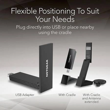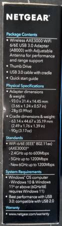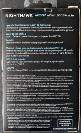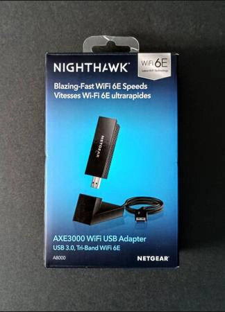 NETGEAR Nighthawk WiFi 6 or 6E USB 3.0 Adapter (A8000) - AXE3000 Tri-Band Wireless Gigabit Speed (Up to 3Gbps) - New 6GHz Band – Works with Any Router Or Mesh System Is Brand New. Features & Details: *Access the exclusive WiFi 6E band for superior HD video conferencing, gaming, and streaming. Simply plug dongle into desktop or laptop. No network card or ISP plan required *Fast AXE3000 WiFi speed, up to 3Gbps, 2.5x faster than WiFi 5 *Find the strongest WiFi signal and best coverage with the flippable antenna *Compact cradle allows for flexible placement *Compatible with any WiFi 6E or WiFi 6 router or mesh system. Requires WiFi 6E router or mesh system to access 6GHz band (WiFi 6E) *Requires Microsoft Windows 11 to connect to the 6GHz band (WiFi 6E) *Supports WPA3, the latest WiFi security standard