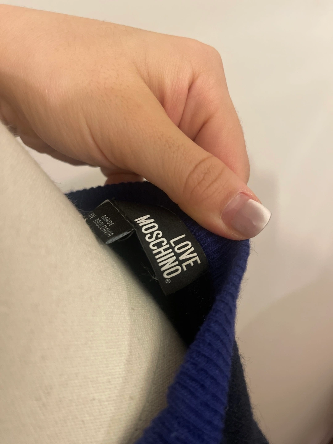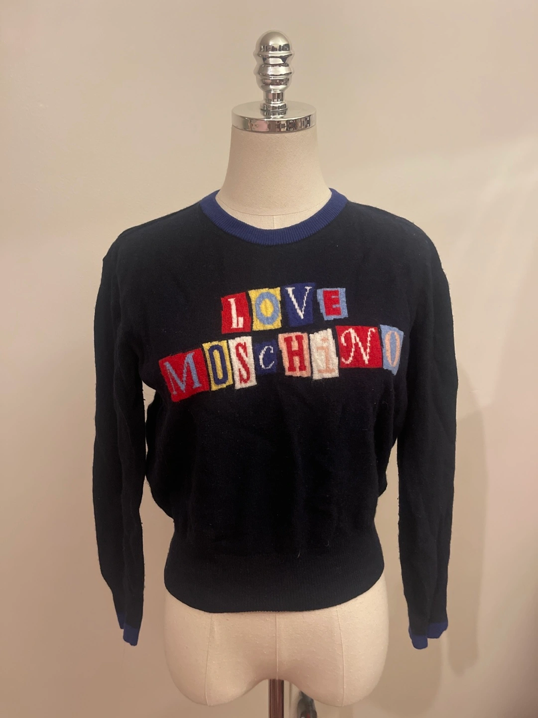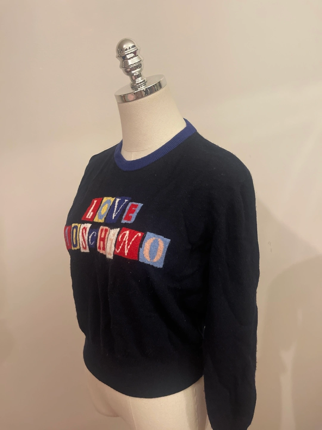 352Navy blue sweater with multicolor block lettering. Long sleeves. Crew neck. Great for fall or winter.