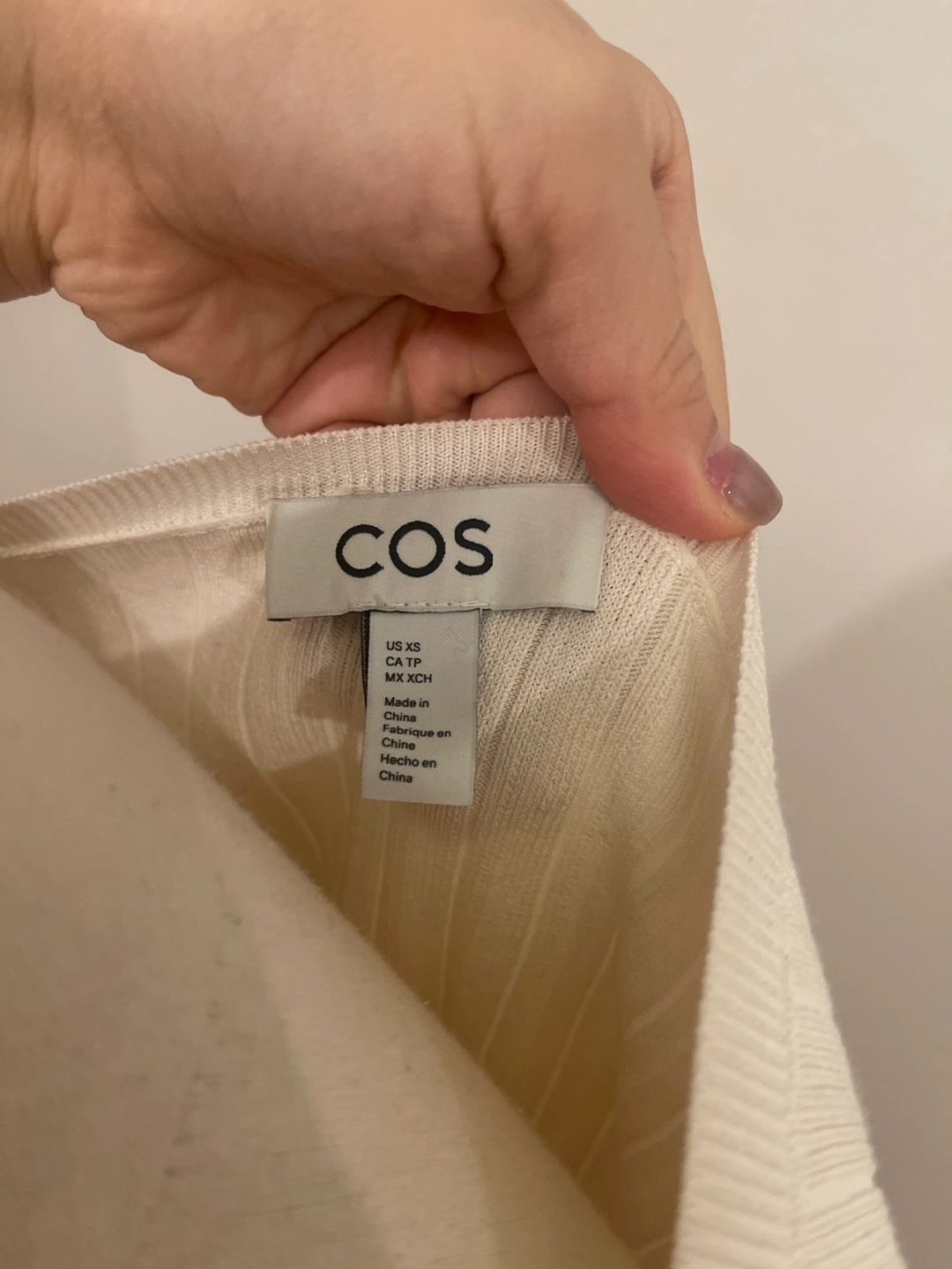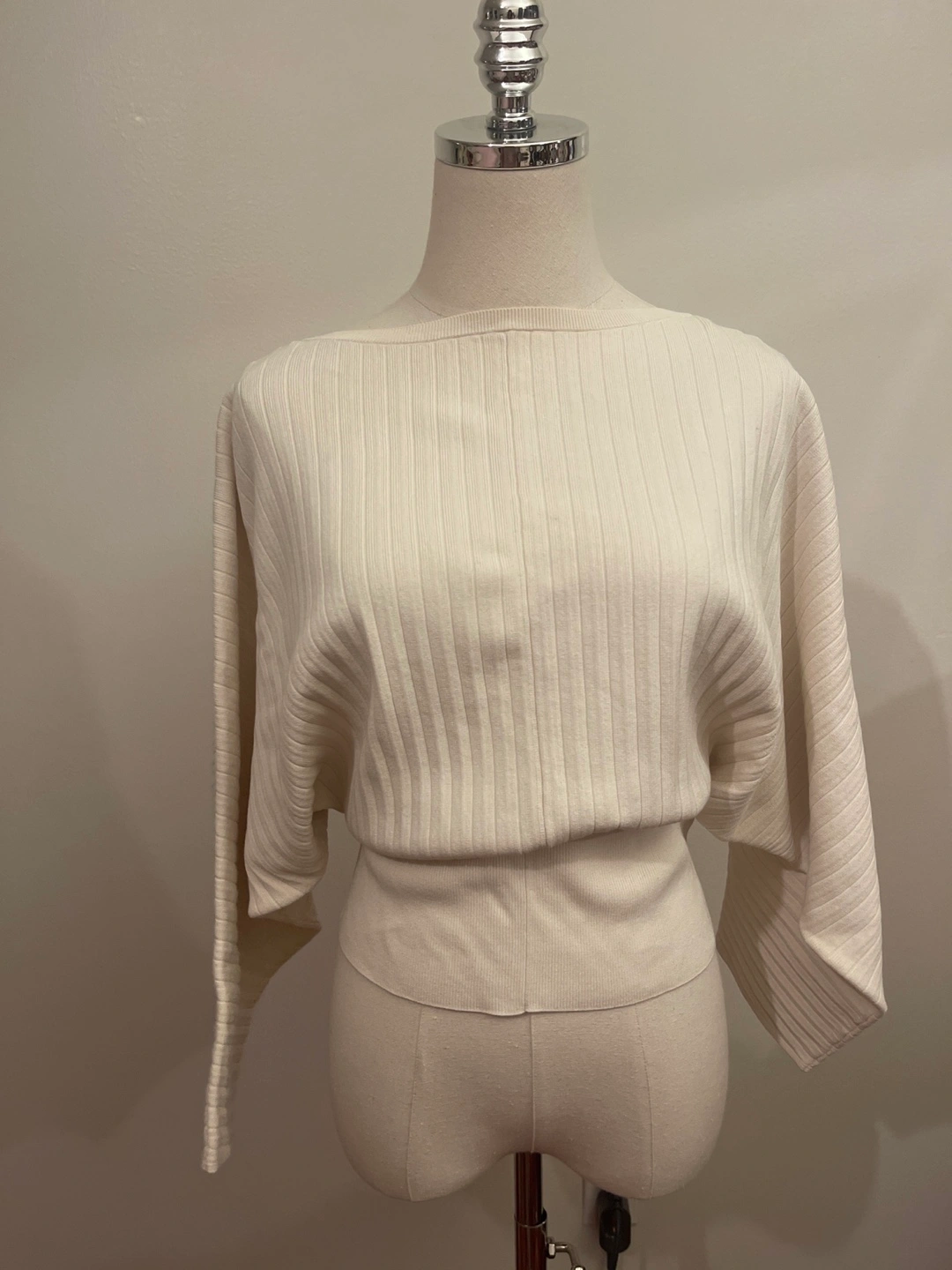 352Cream-colored ribbed knit top. Size XS. Boatneck. Three-quarter sleeves. Fitted bodice.