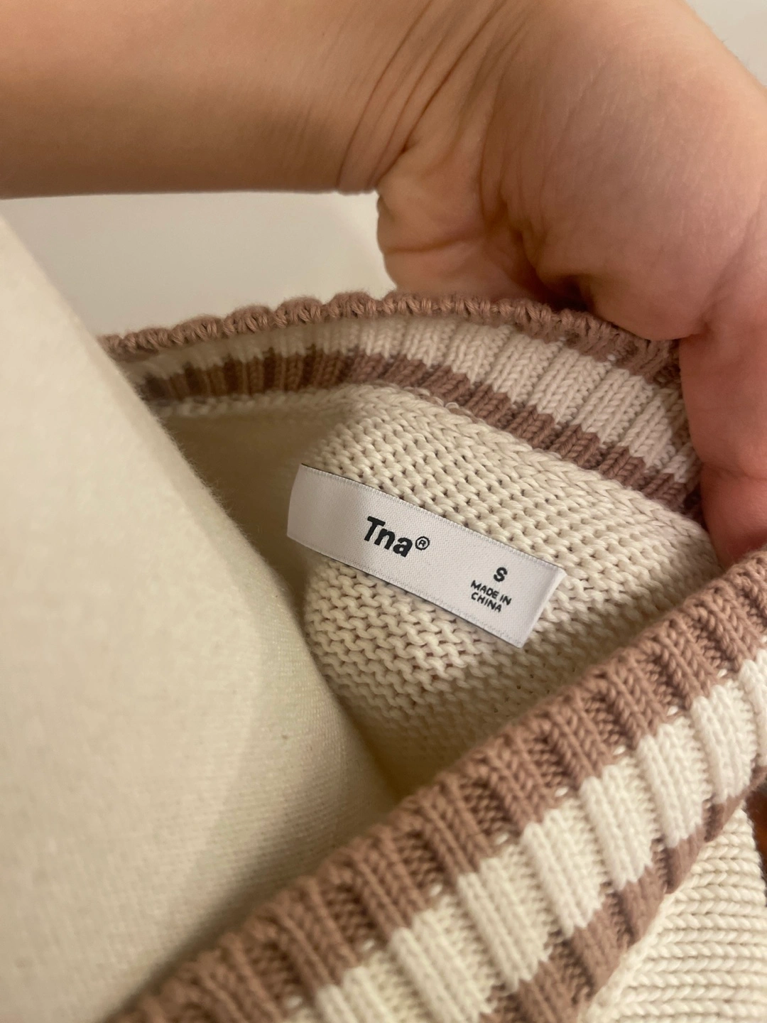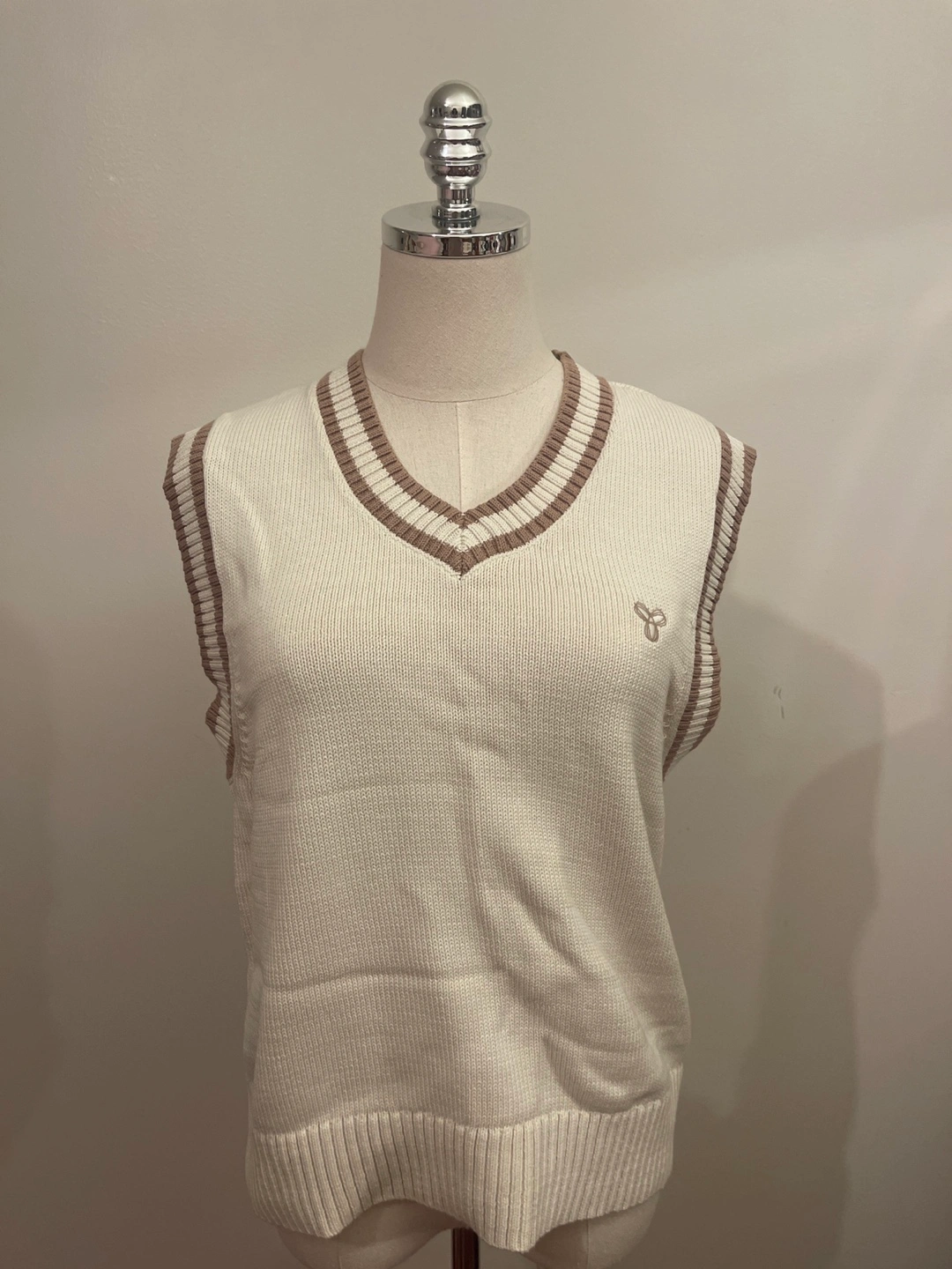 352Never worn. Adorable cream-colored sleeveless sweater vest. Features a V-neck and brown and white stripes. Size small. Made in China.