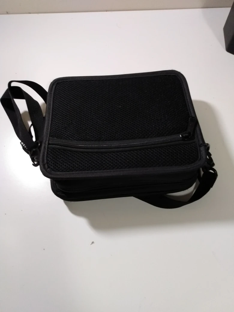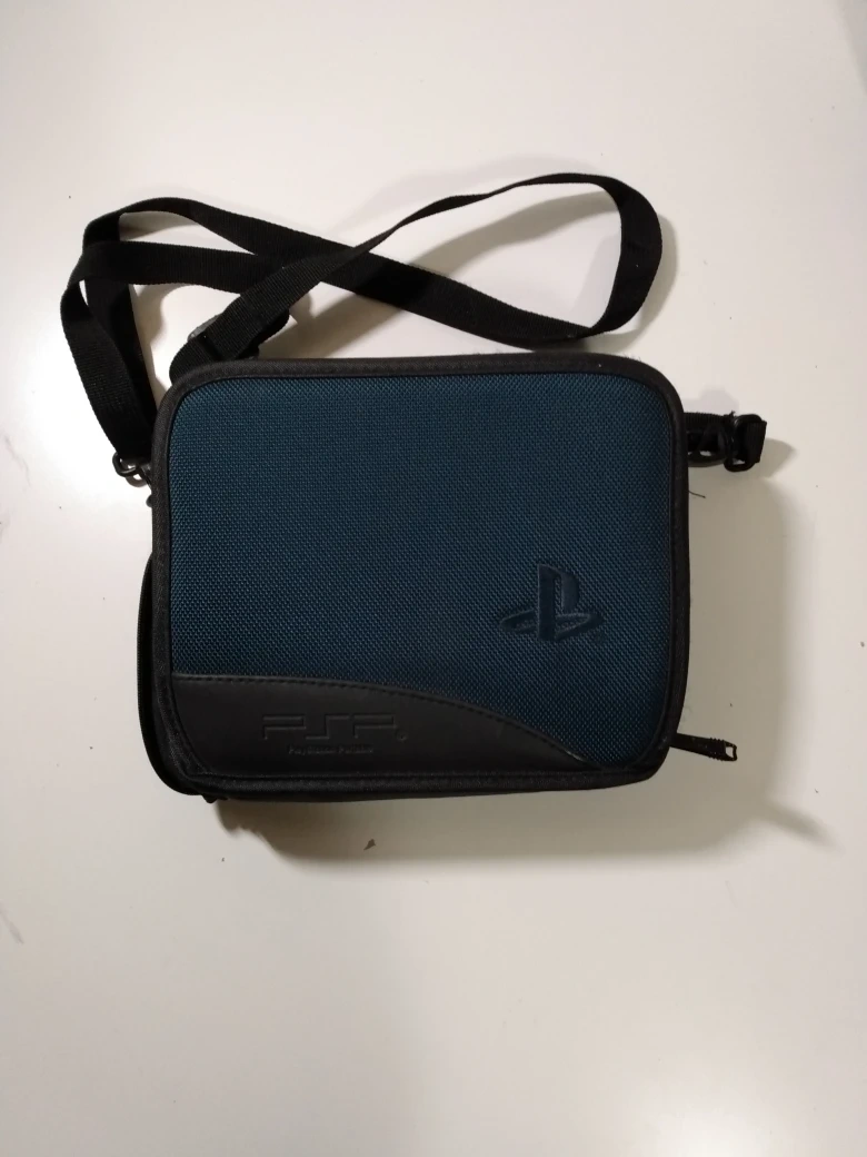 Black and blue carrying case for PlayStation Portable. Features an adjustable shoulder strap and zipper closure. Room for console and games.