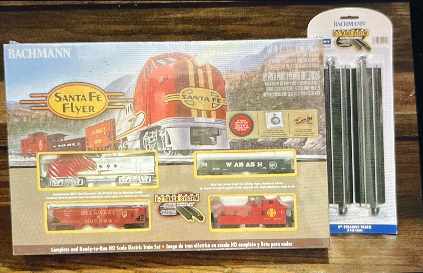 Complete and ready-to-run HO scale electric train set. Features Santa Fe Flyer locomotive with operating headlight, two freight cars and speed controller. Includes EZ Track system. Great for hobbyists. Incudes extra tracks.