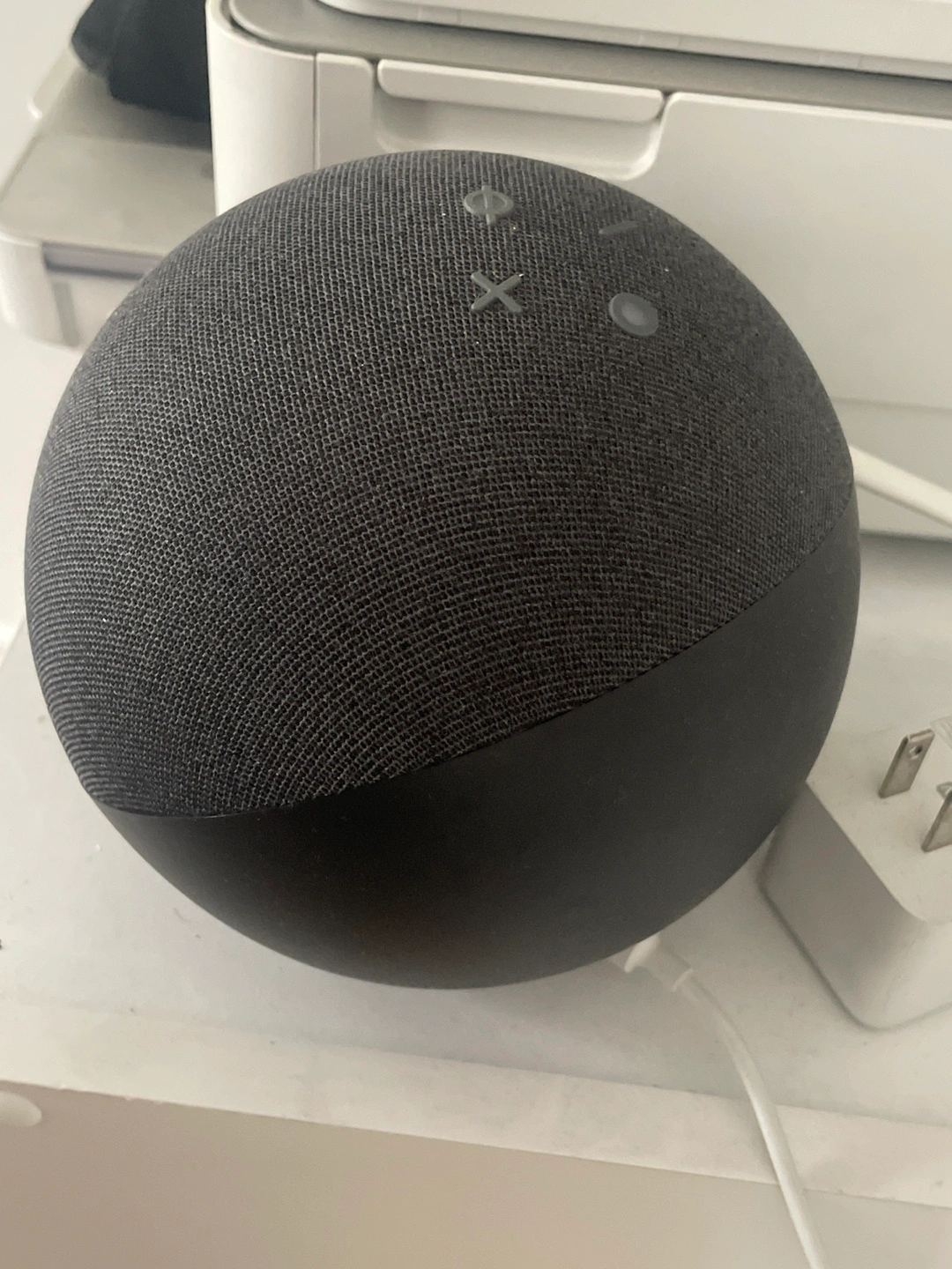 Smart speaker with fabric cover. Compact design. Includes power adapter. Out of warranty but new-like condition. This is NOT Echo dot (smaller one) but Echo (bigger one).