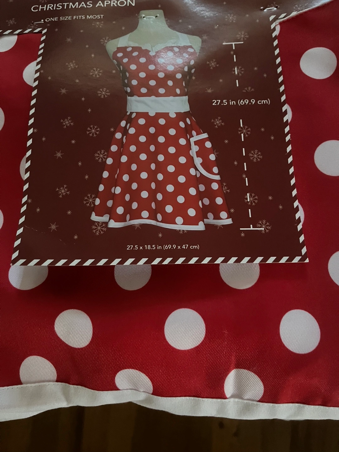 15Adorable apron. Red with white polka dots. One size fits most. Features a white waist band and pockets. Perfect for baking or cooking.