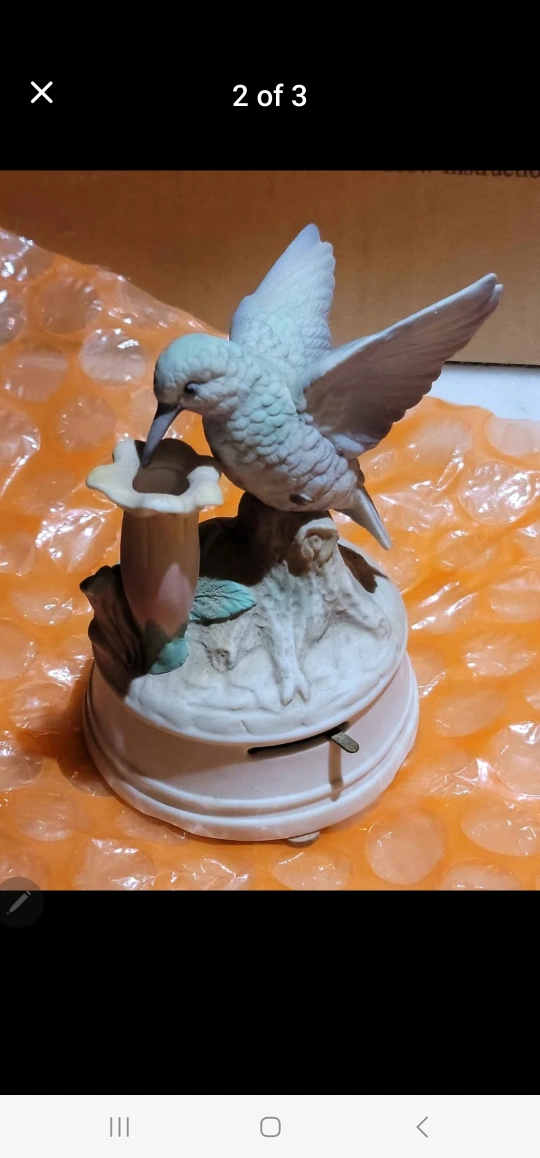 18Porcelain hummingbird figurine. Plays music. Features a hummingbird perched on a flower. Beautiful detail.