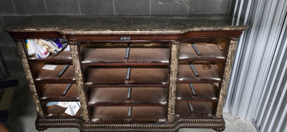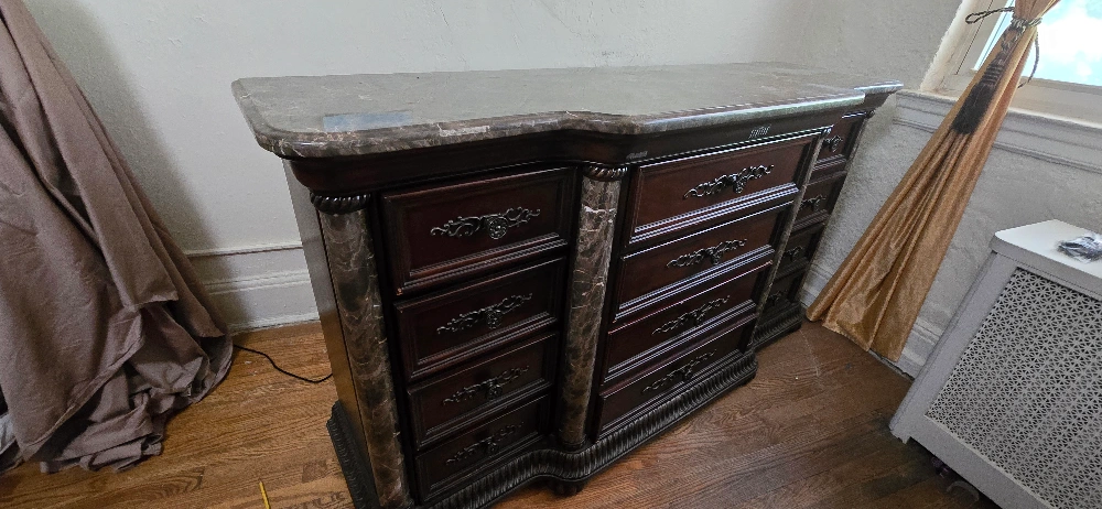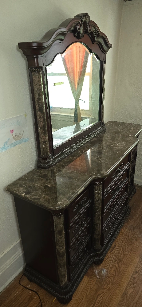 Elegant dresser with a marble top and attached mirror. Multiple drawers offer ample storage. Dark wood finish. Some assembly may be required.