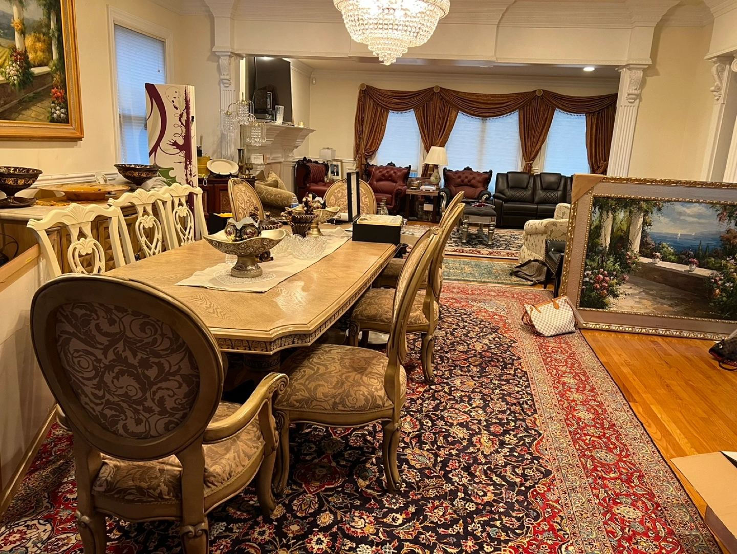 Beautiful oil painting, ornate gold frame. Depicts a European street scene. Perfect for adding elegance to your home. Includes easel for display. Large Moving sale hundreds of items 201-602-7108.