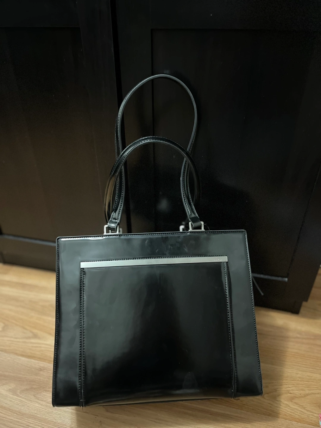 670Black patent leather tote bag. Top zip closure. Two top handles. Interior zip pocket and slip pockets. Great everyday bag.