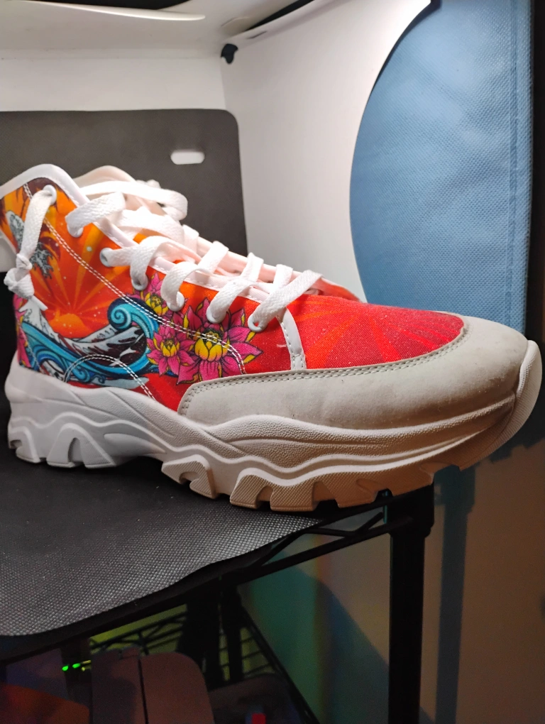 Unique high-top sneakers. Colorful wave and floral design. Thick white sole. Lace-up closure. Great for casual wear. Used 3 times