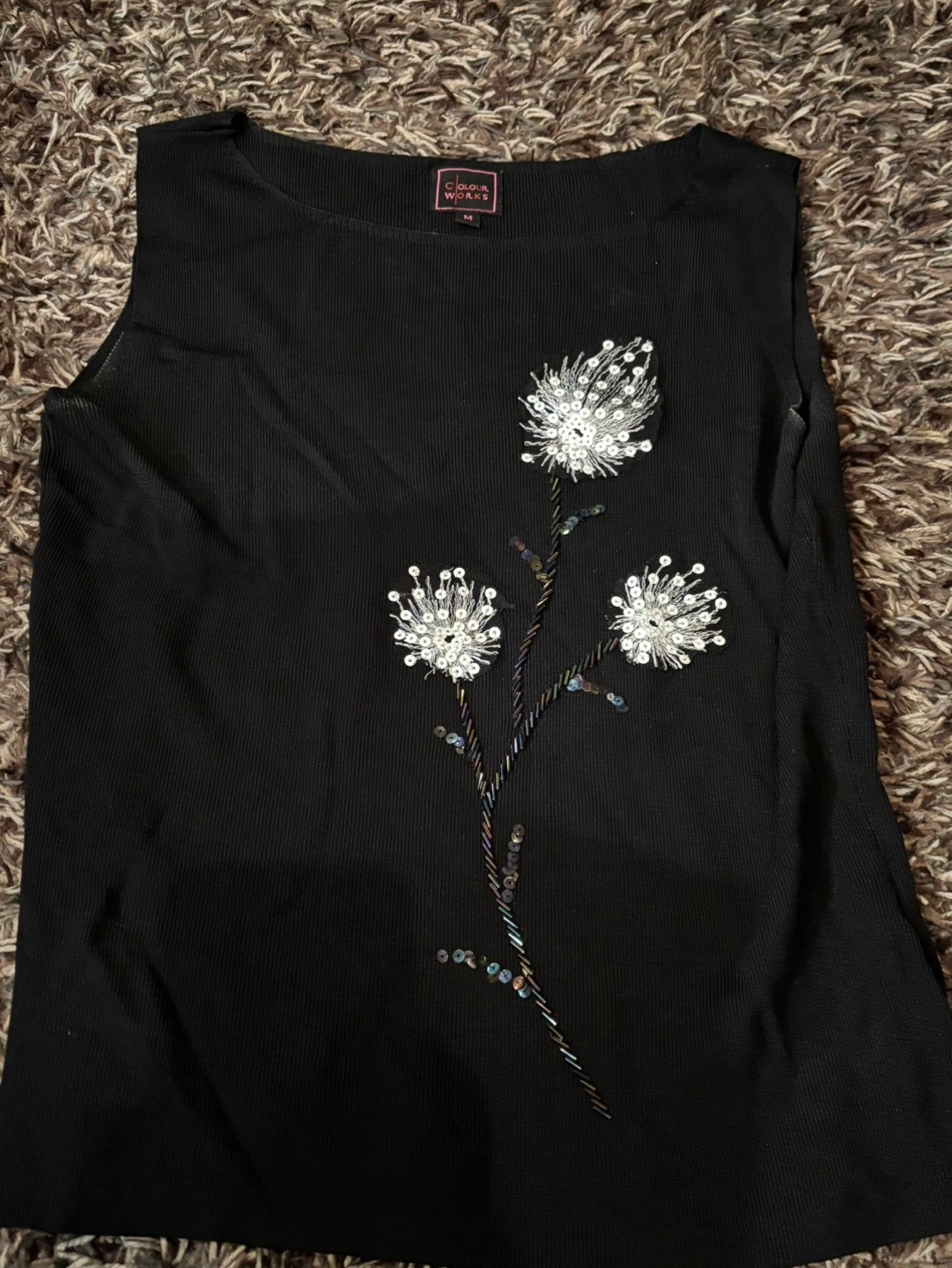 60Black sleeveless top. Size medium. Ribbed fabric. Floral sequin embellishment. Great for evenings out.