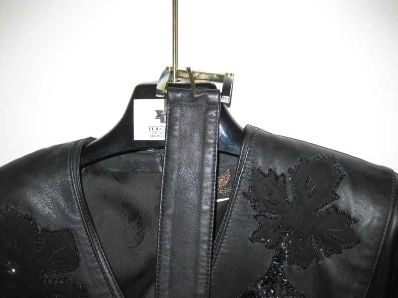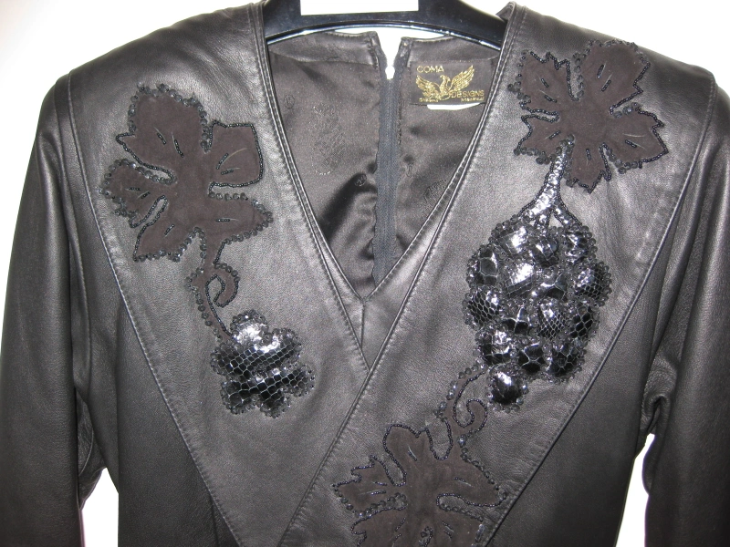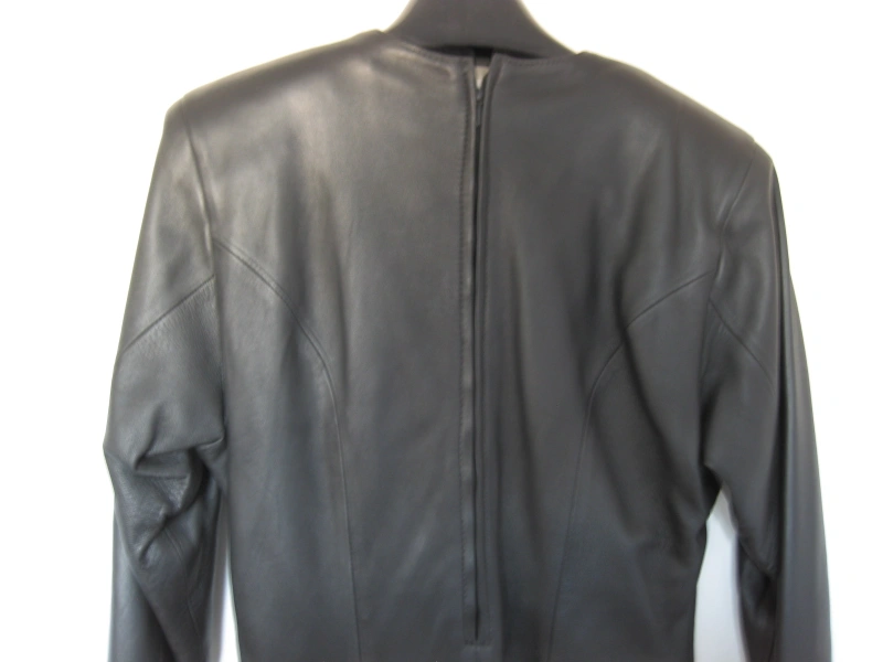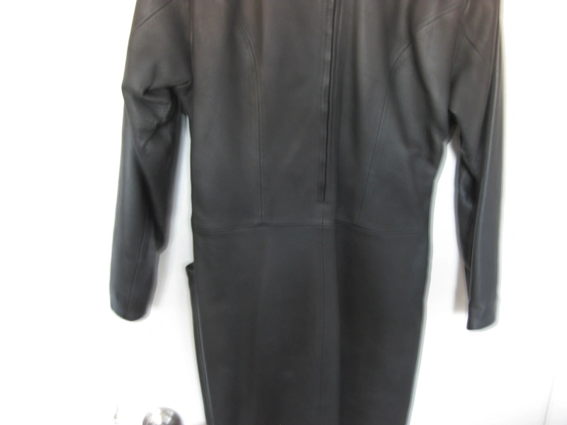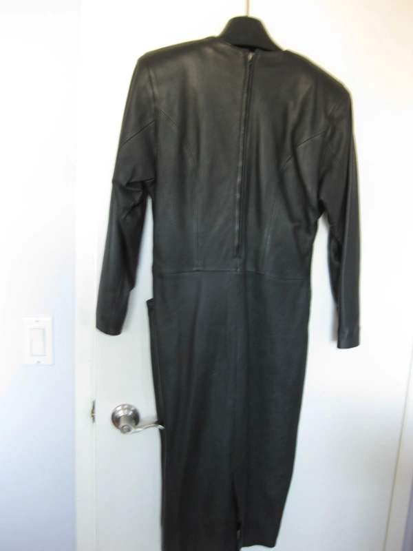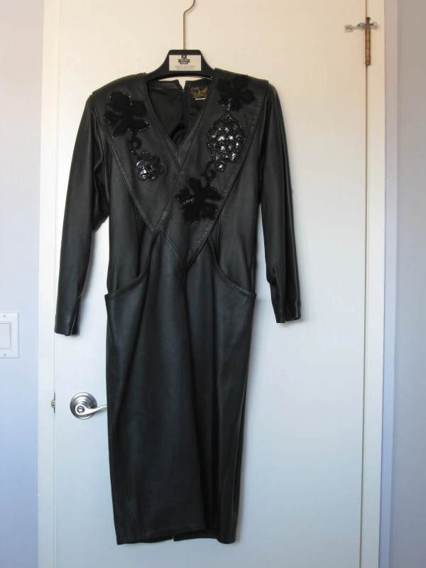 I am selling a Long Genuine Real Leather Women Dress with Embellishments in excellent condition. Only worn twice. Vintage style from the early 1990s. Elevate your wardrobe with this exquisite genuine black leather dress, a true blend of edgy style and elegant detailing. This dress features a sophisticated midi length, long sleeves, and a flattering V-neckline.